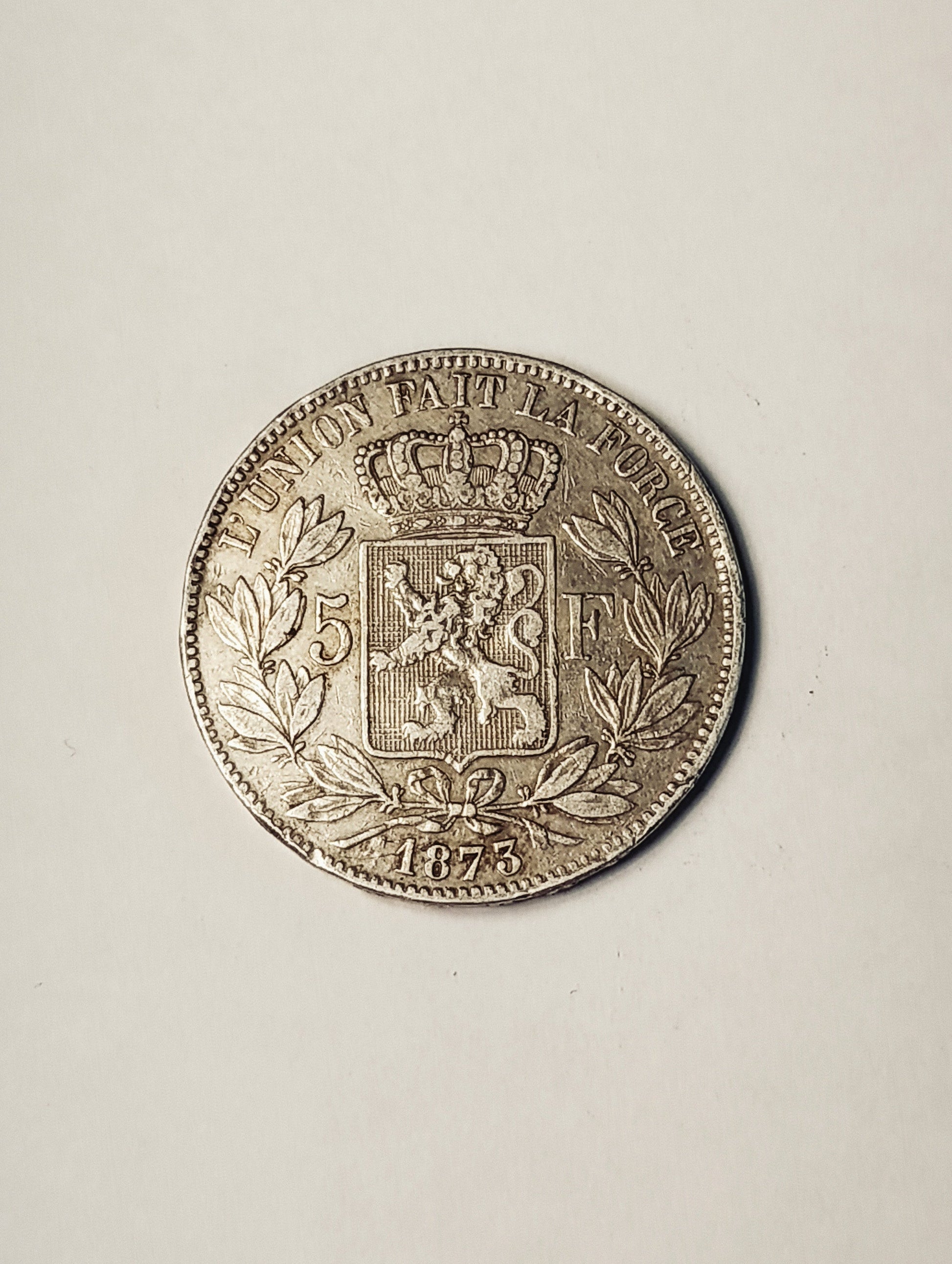 Monnaie en argent de 5 francs à l’effigie de Léopold II, roi des Belges. Avers avec portrait de Léopold II et légende « LEOPOLD II ROI DES BELGES ». Revers avec armoiries couronnées, devise « L’UNION FAIT LA FORCE », valeur 5 F et date 1873. Poids 20,24 g, diamètre env. 37 mm. Belle pièce ancienne avec usure homogène et patine naturelle, conforme aux caractéristiques des 5 francs belges en argent du XIXᵉ siècle. Intéressante pour collection de monnaies européennes, numismatique belge ou argent ancien.
