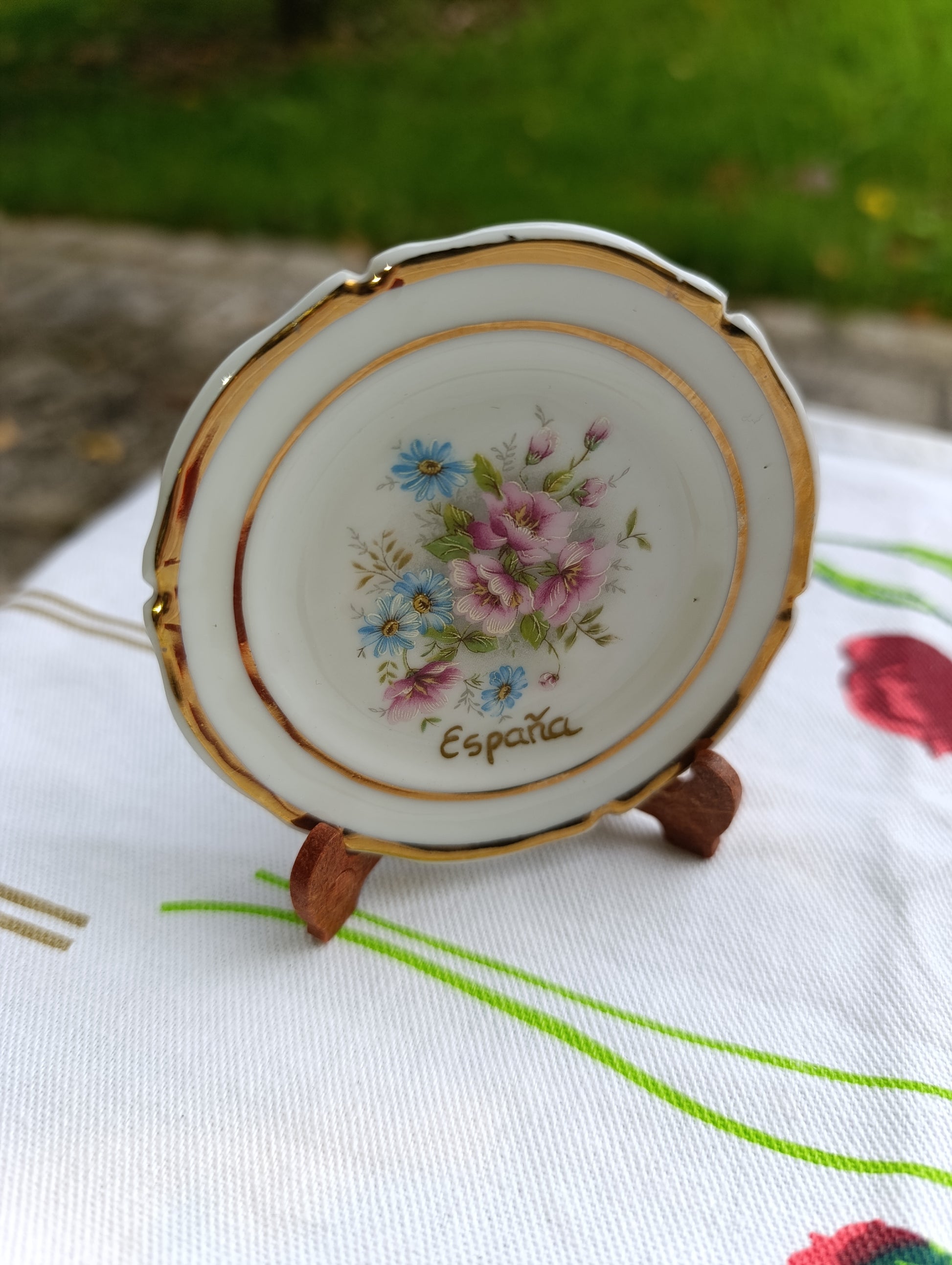 espagne, girona, artesania batlle, assiette souvenir, porcelaine dorée, fleurs vintage, déco espagnole, collection voyage, céramique artisanale