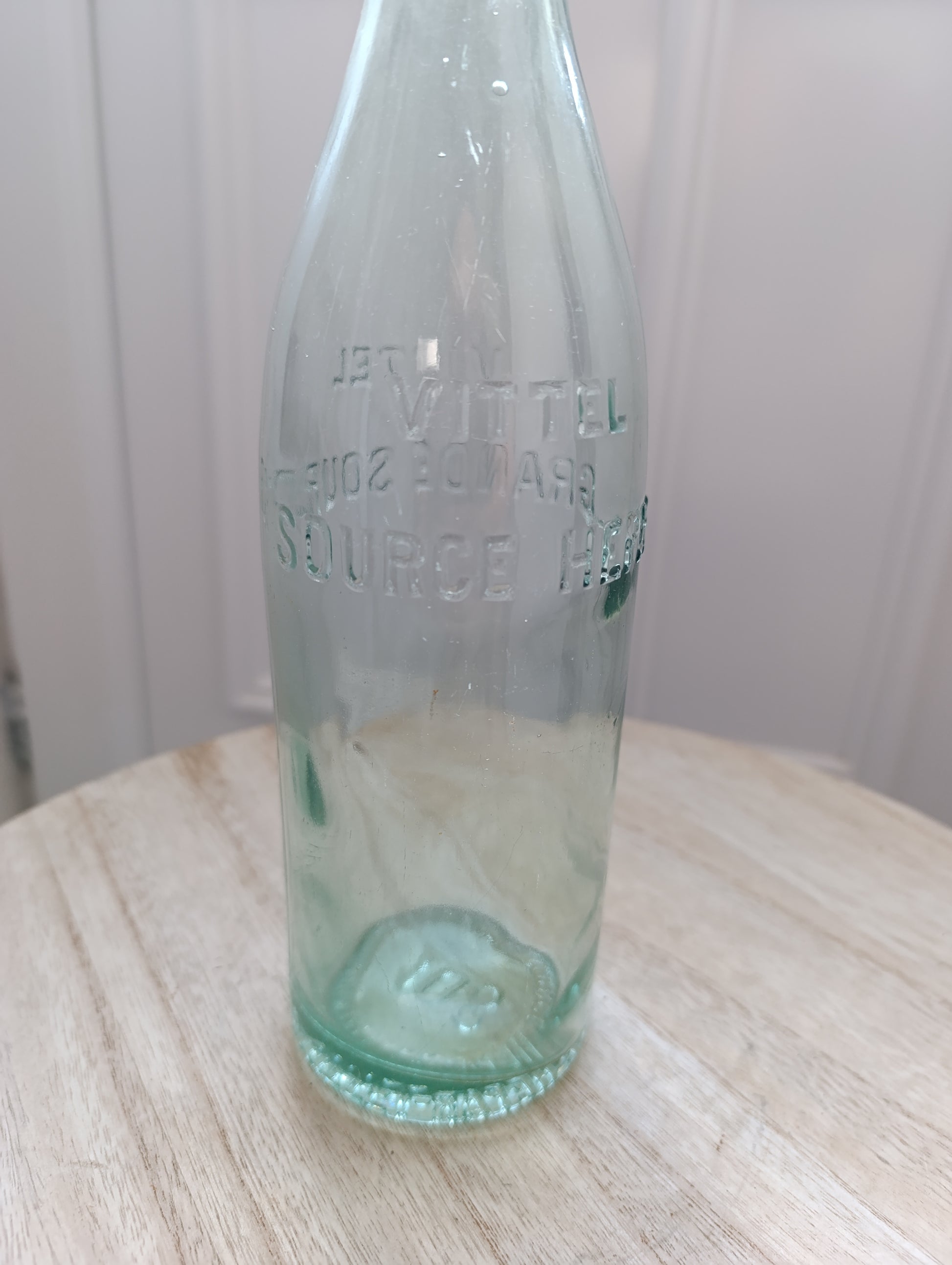 bouteille ancienne, bouteille verre Vittel, Vittel Grande Source, déco vintage cuisine, bouteille embossée, verre vert ancien, bouteille hepar, collection verrerie, bouteille pharmacie, brocante