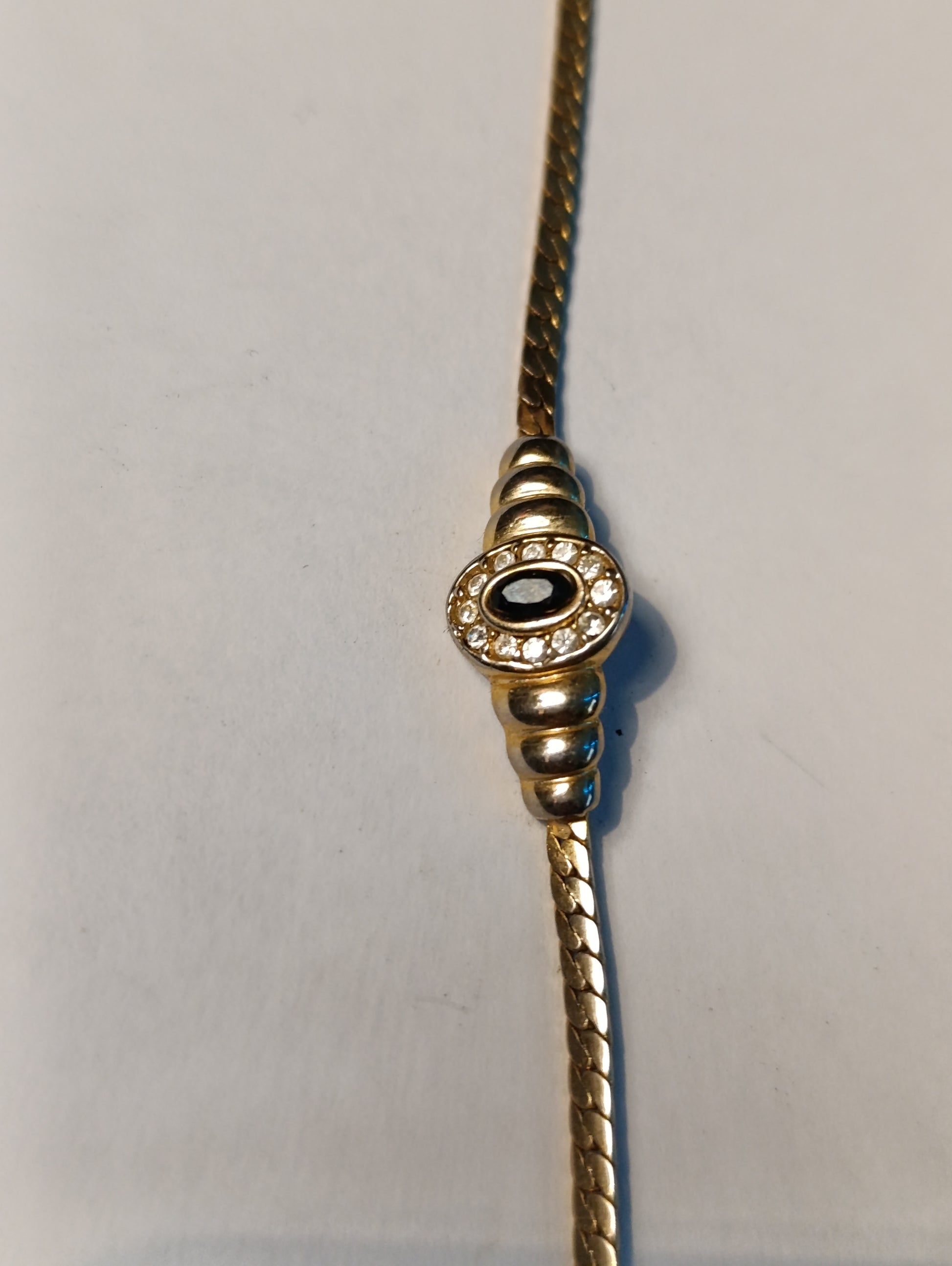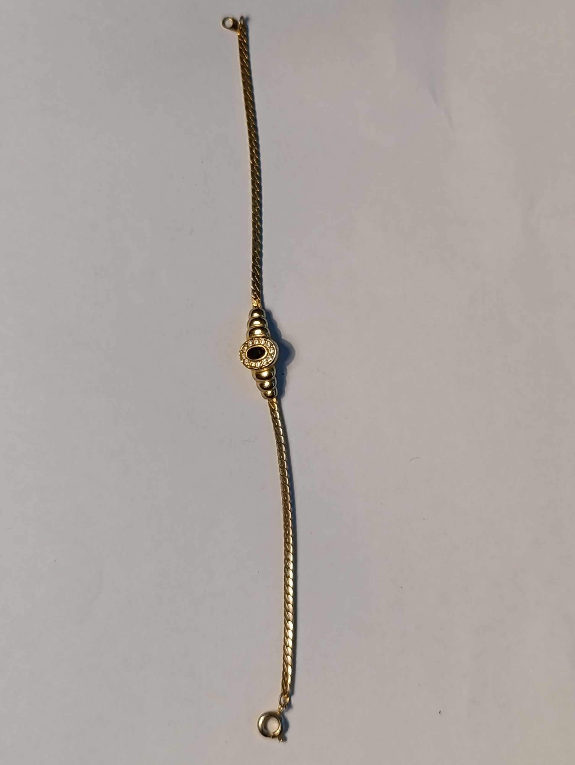 Bracelet de fantaisie vintage en métal doré, chaîne fine élégante avec motif central ovale orné d’une pierre noire entourée de strass. Bijou ancien bien fait, finitions soignées, très bel état général. Léger et agréable à porter, fermoir fonctionnel. Aucun poinçon visible, bijou fantaisie assumé, décoratif et raffiné, idéal en usage quotidien ou pour une tenue habillée. Longueur env. 19 cm, poids env. 6 g.