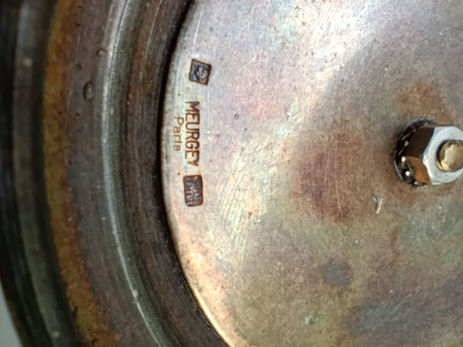 Chandelier vintage à trois bras en métal, signé MEURGEY Paris sous la base. Modèle ancien avec une belle patine naturelle, idéal pour une ambiance rétro ou une déco brocante chic. Fabrication française de qualité, stable et robuste.