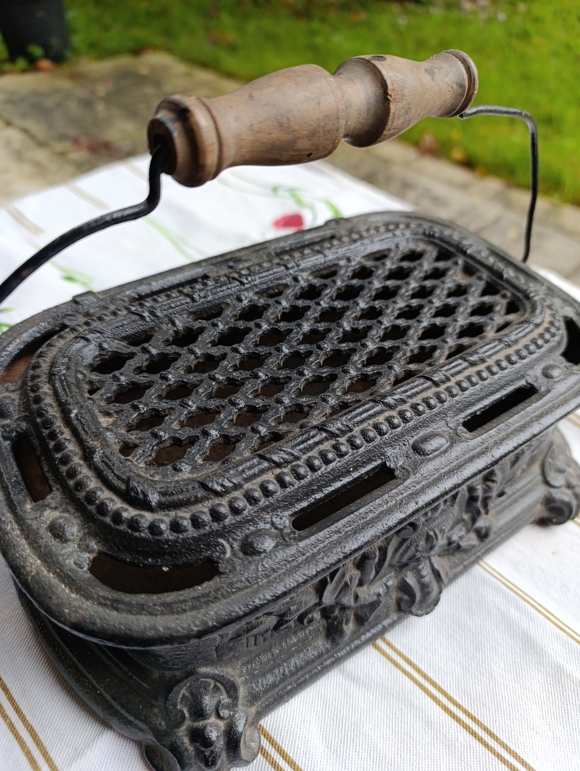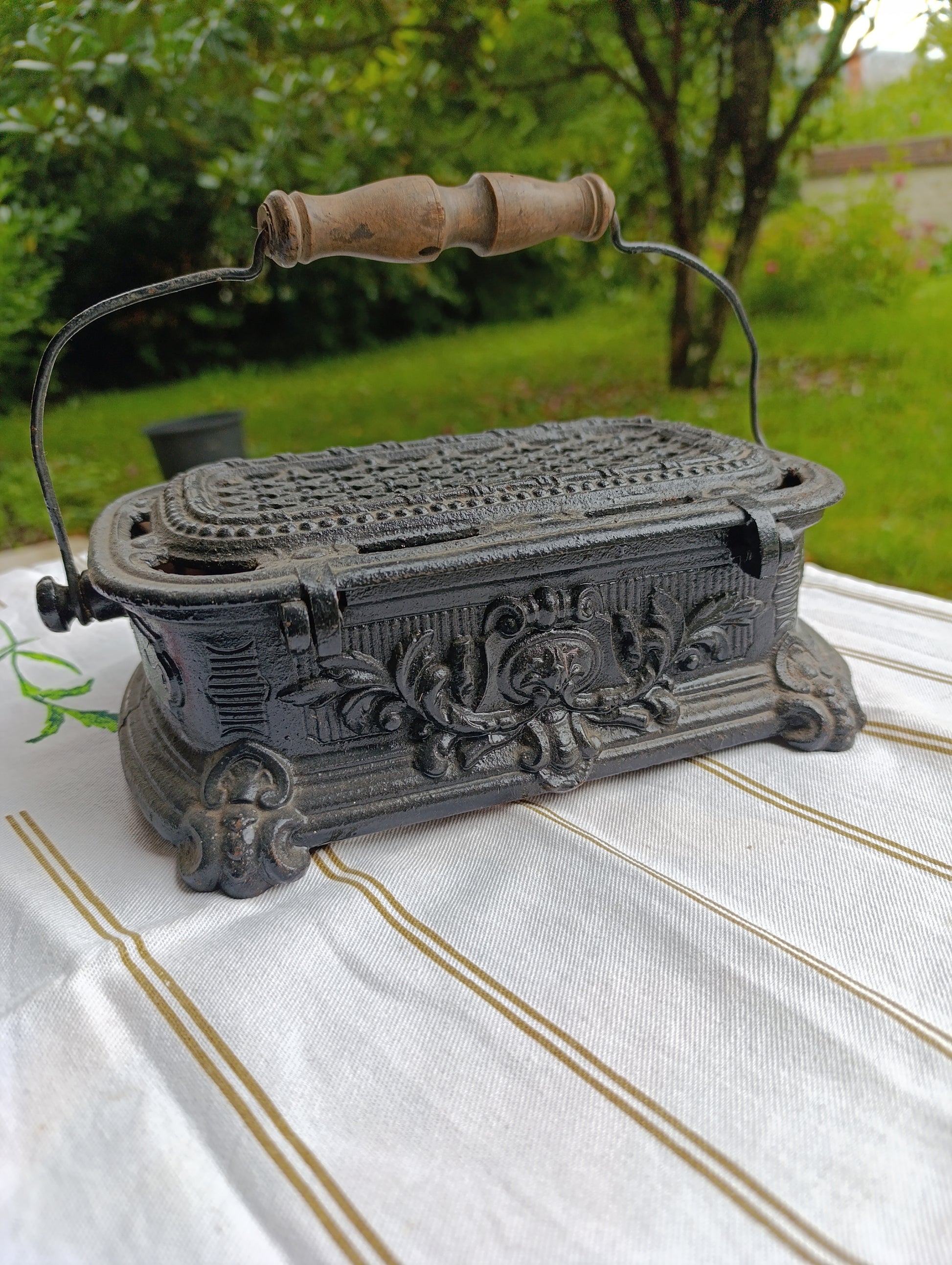 chaufferette, brasero fonte, chauffe pieds, chauffe mains, poêle ancien, déco industrielle, campagne chic, fonte ajourée, poignée bois, brocante