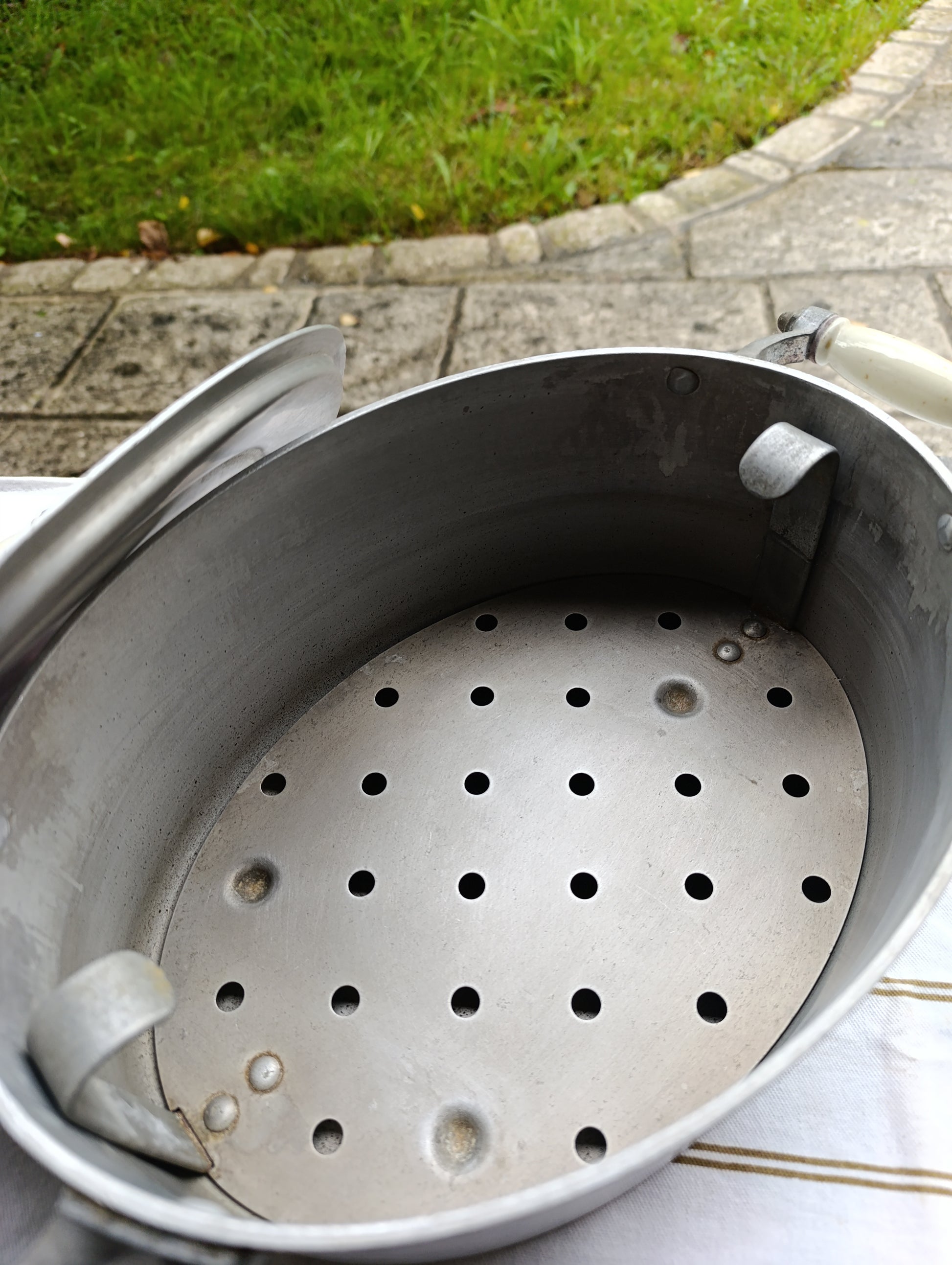 cocotte aluminium, cocotte ovale, faitout ancien, panier vapeur, poissonnière vintage, bakélite, ustensile cuisine, déco rétro, couvercle, brocante, 31x22
