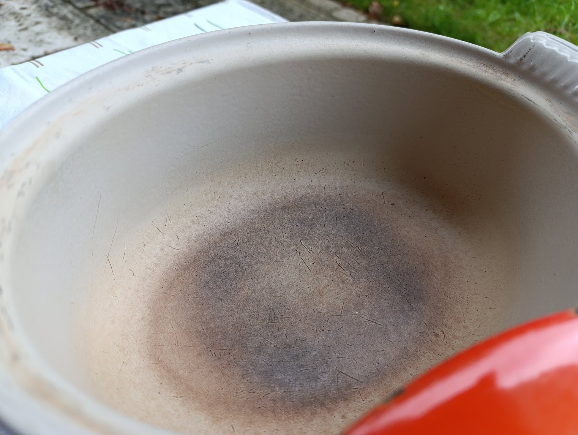 État : bon état d’usage ; intérieur patiné/griffé par la cuisson, quelques marques sur le pourtour (voir photos).