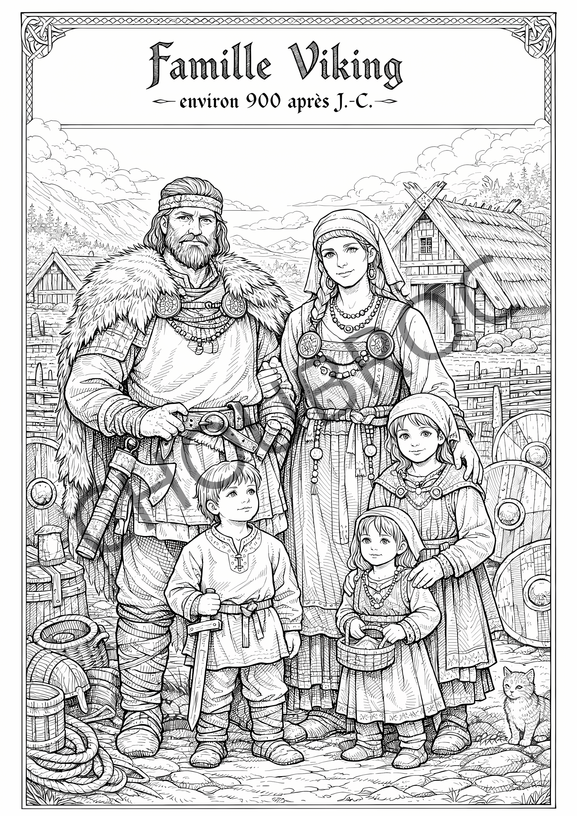 Cet e-book propose 5 grandes scènes historiques fidèlement inspirées de la vie viking entre le IXe et le Xe siècle : famille, guerrier, marchand, travail artisanal et cérémonie collective. Chaque illustration occupe une page A4 complète, avec des traits fins, des textures complexes et de nombreux détails à colorier.