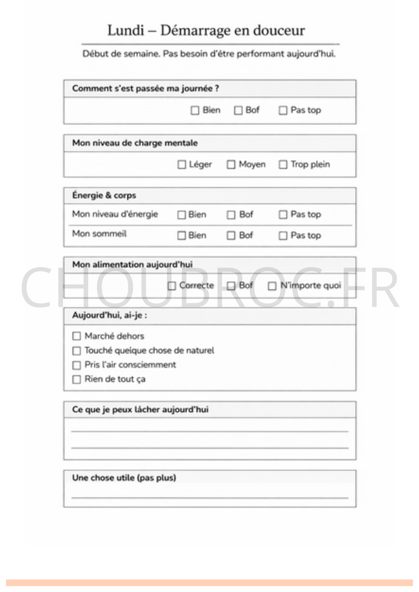 Chaque journée propose des cases simples à cocher (bien, bof, pas top) afin de prendre conscience de son énergie, de son sommeil, de son alimentation et de son état mental.