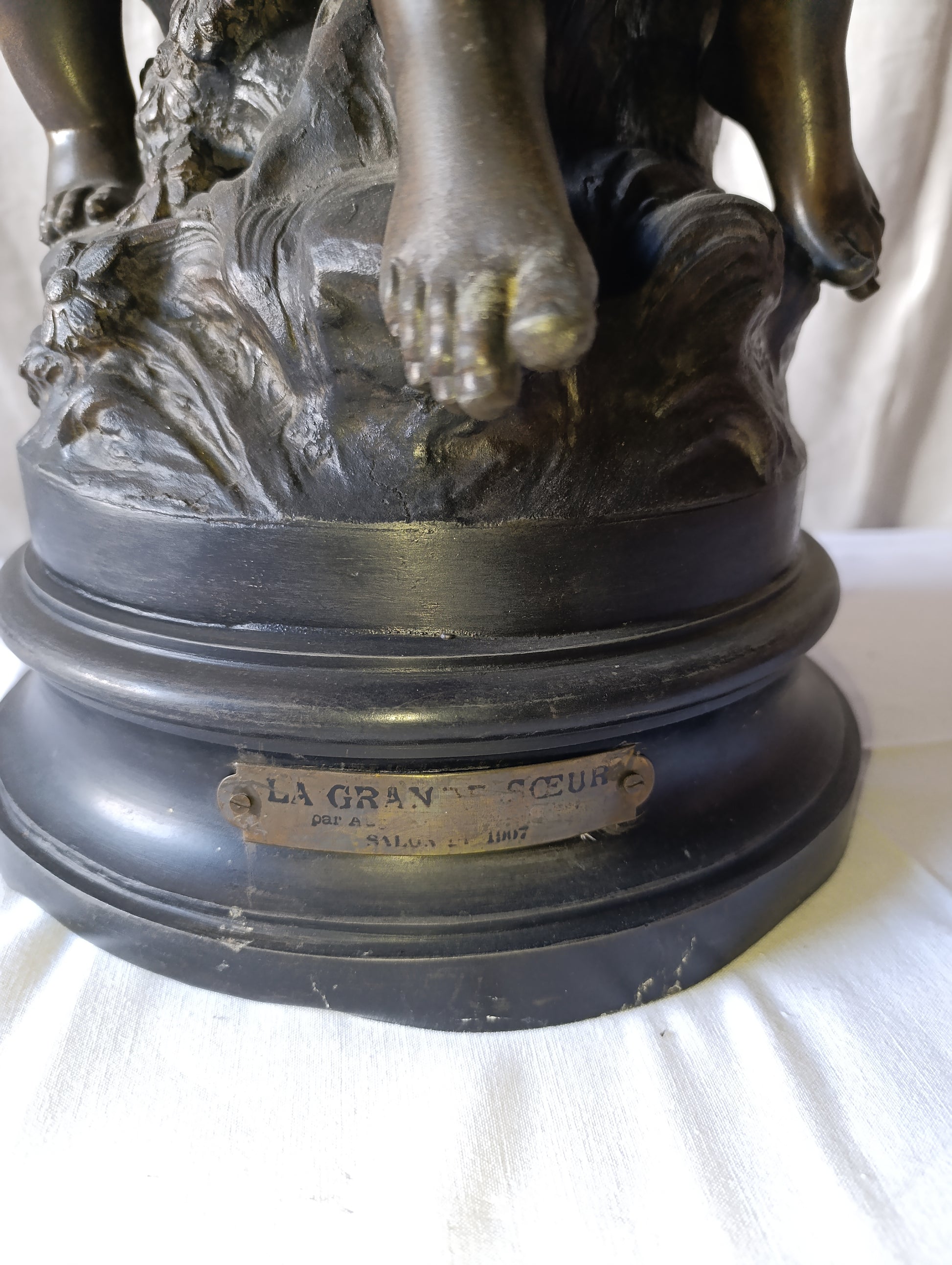 Superbe statue en régule signée Moreau, représentant deux enfants en train de lire.