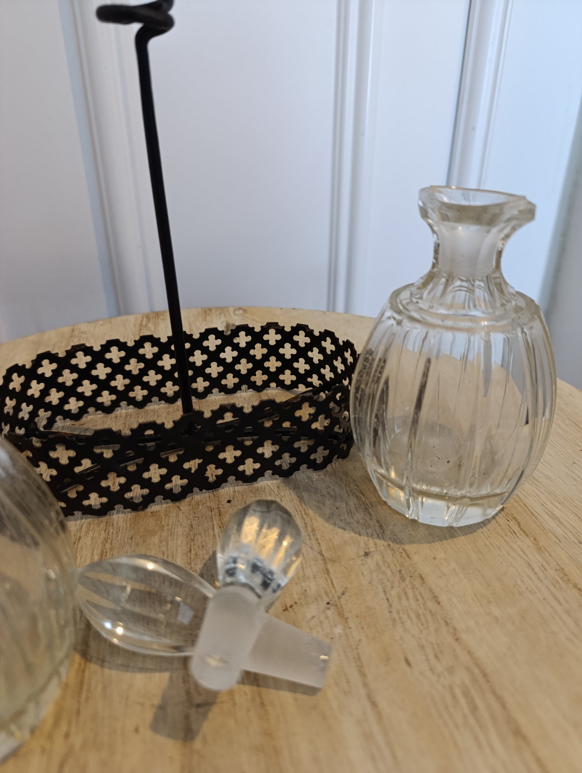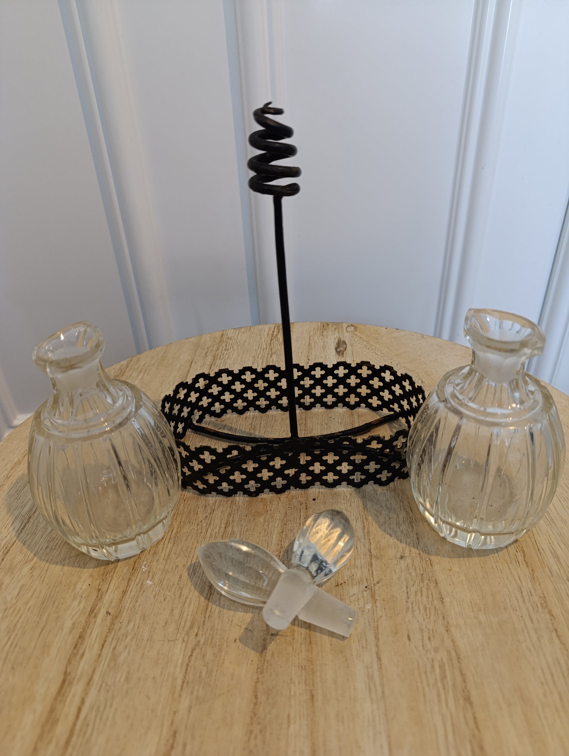 huilier ancien, vinaigrier vintage, flacons verre taillé, huilier métal noir, ustensile rétro cuisine, déco table brocante, accessoires de table vintage, huilier collection, huilier flacon bouchon verre