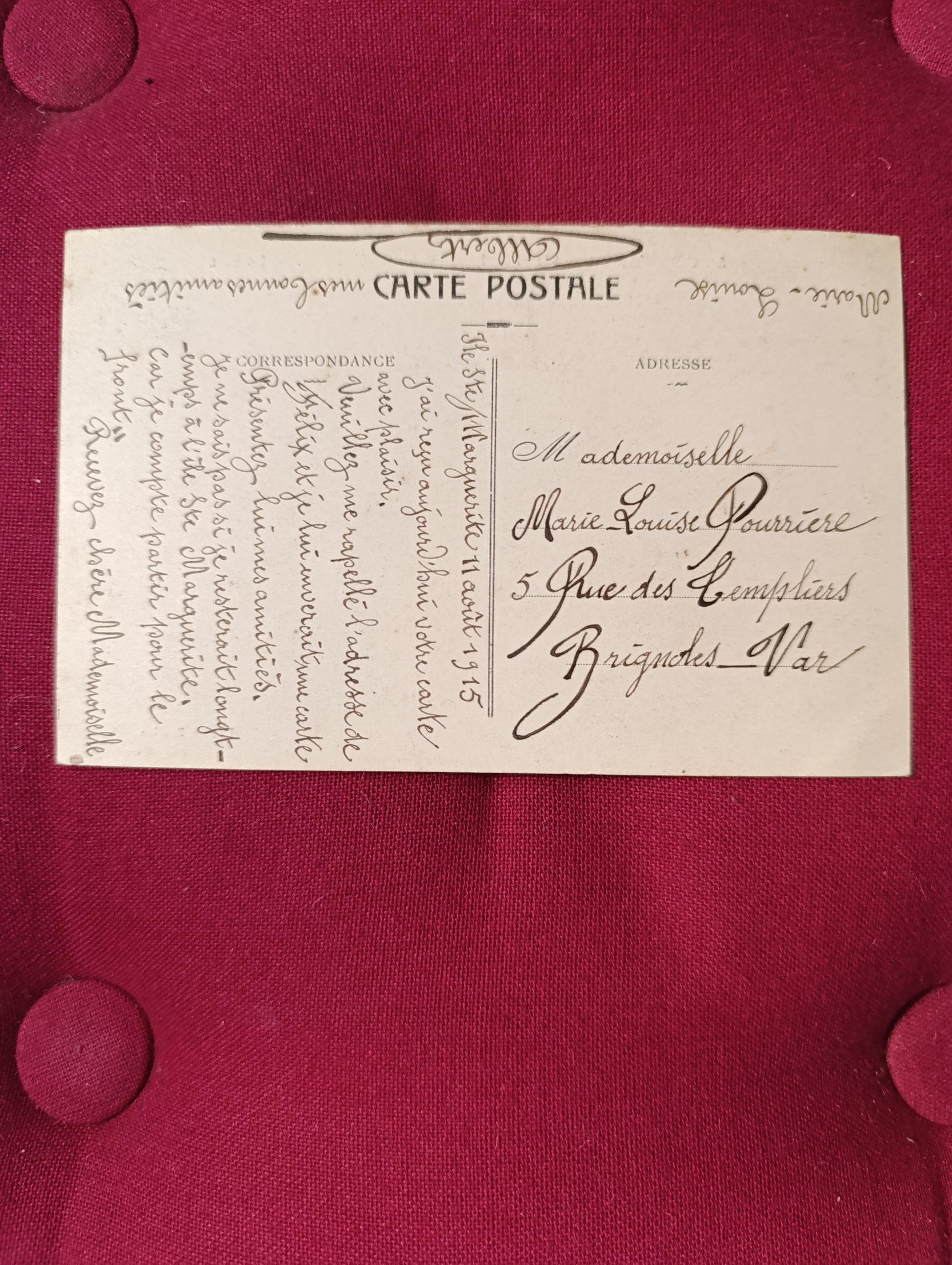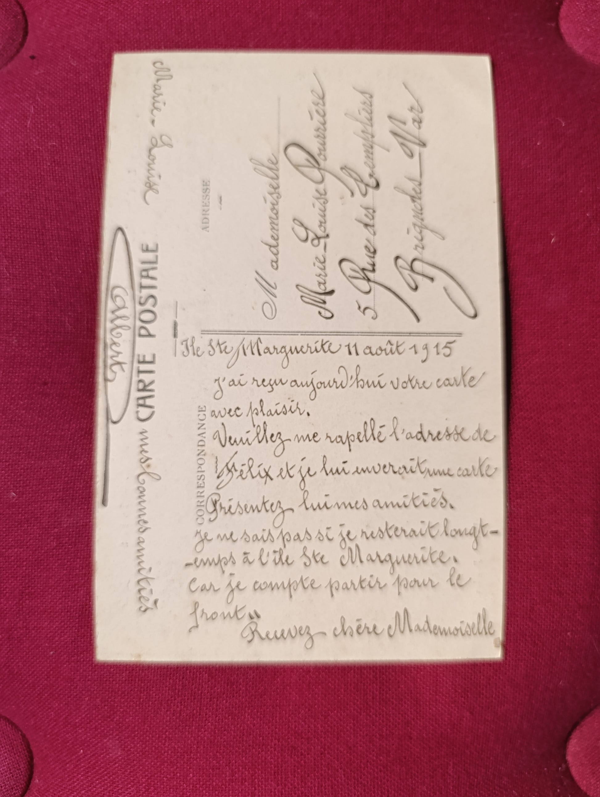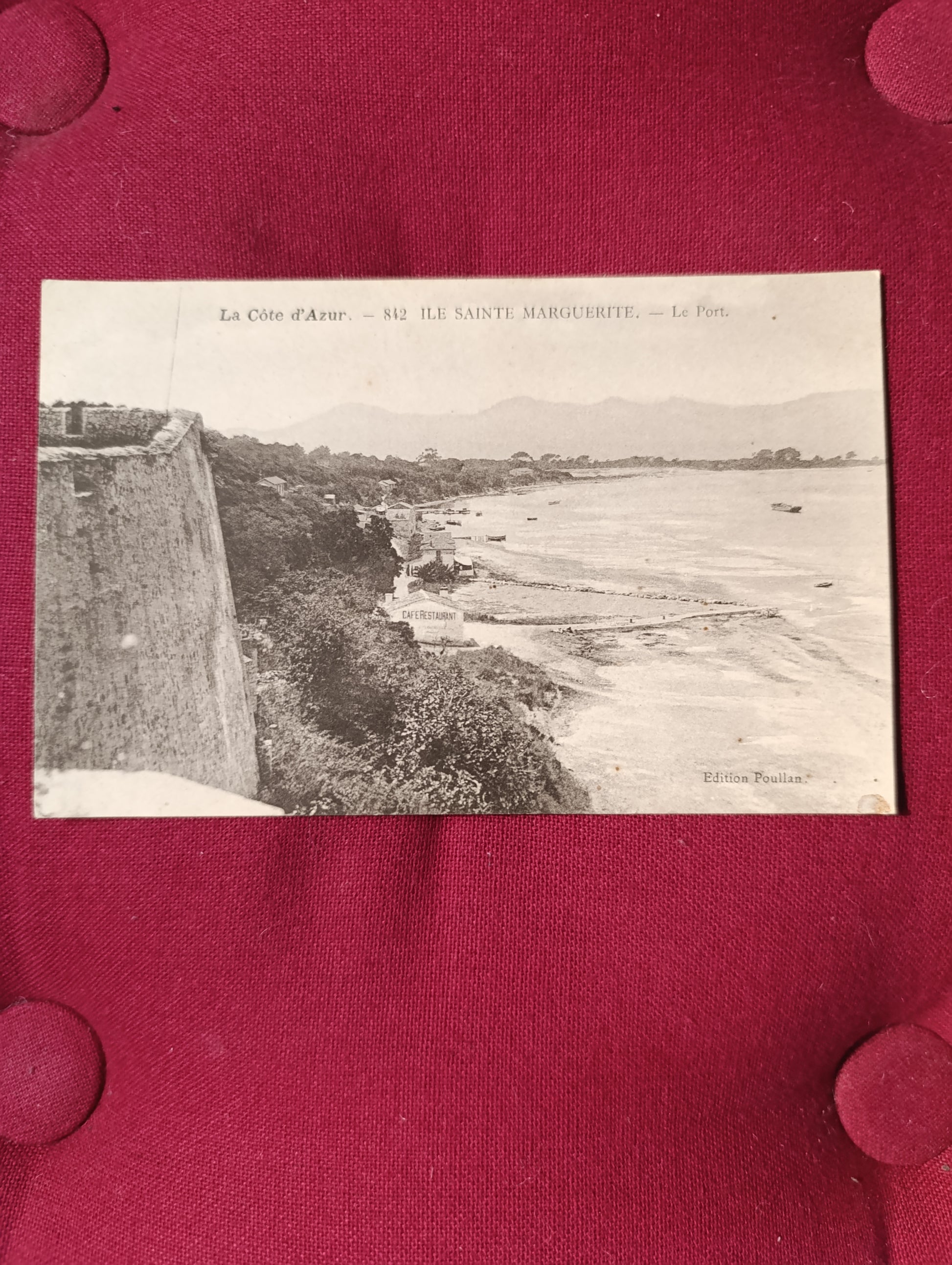 Carte postale ancienne représentant le port de l’Île Sainte-Marguerite, au large de Cannes. Belle vue panoramique sur la côte, la mer et les installations portuaires, avec reliefs en arrière-plan. Carte emblématique de la Côte d’Azur au début du XXe siècle. Carte écrite et circulée, datée de 1915, avec correspondance manuscrite bien lisible. Légères marques du temps et petite usure normale pour l’âge, ensemble en bon état de conservation. Très recherchée par les collectionneurs de Provence, îles, vues maritimes et cartes anciennes de la Riviera.