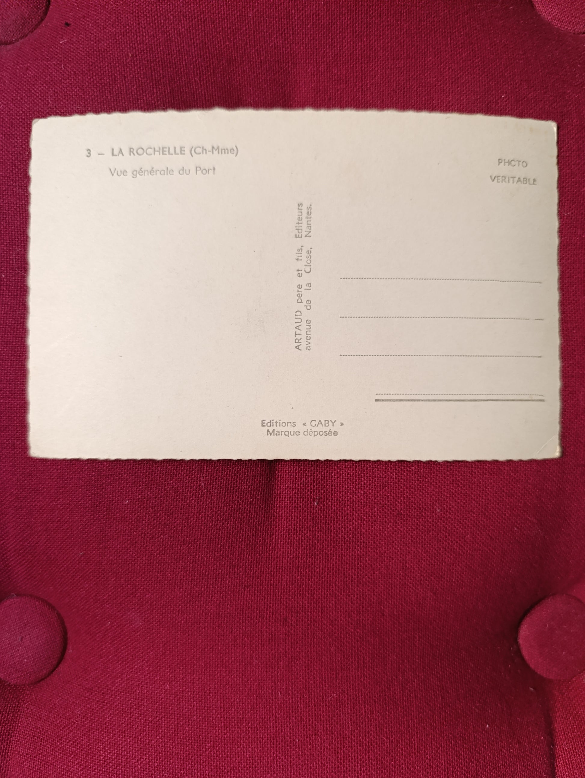 Carte postale ancienne montrant une vue panoramique du port de La Rochelle avec ses célèbres tours, les quais animés et les bateaux au mouillage. Belle photographie d’époque illustrant l’activité maritime et le front de mer de la ville au début du XXᵉ siècle. Carte éditée par Artaud père et fils, Éditions Gaby, Nantes, mention « Photo véritable ». Non écrite, non circulée. Bon état général, légères marques du temps et petites rousseurs possibles, bords dentelés bien présents.