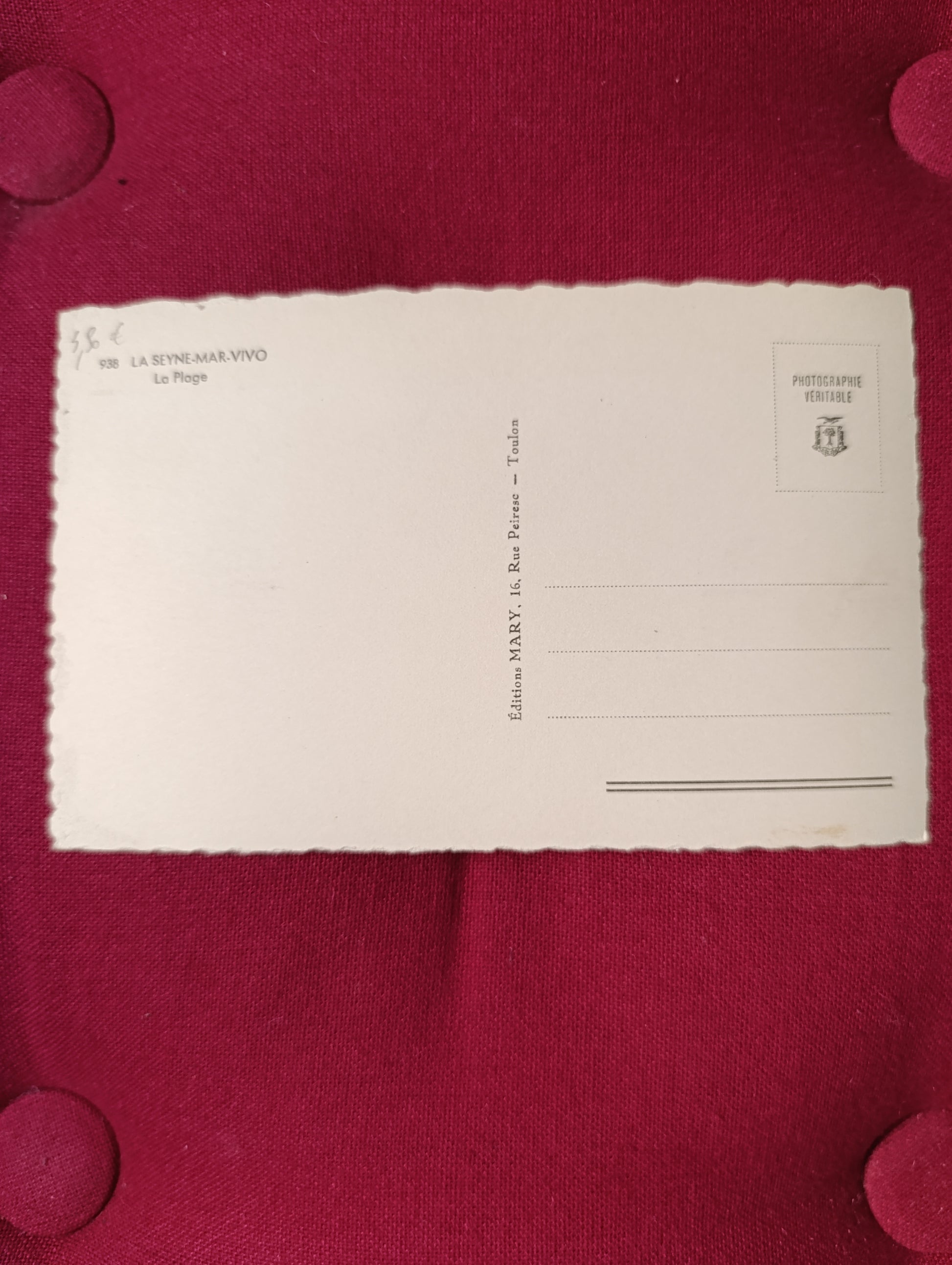 Carte postale ancienne représentant la plage de La Seyne-sur-Mer, scène animée avec baigneurs, promeneurs et bord de mer typique de la côte varoise. Belle vue estivale très vivante, intéressante pour l’ambiance balnéaire et la vie quotidienne d’époque. Carte en photographie véritable, non écrite / non circulée, dos vierge. Éditeur MARY, Toulon. Bords dentelés, légères marques du temps sans gravité, bon état général.