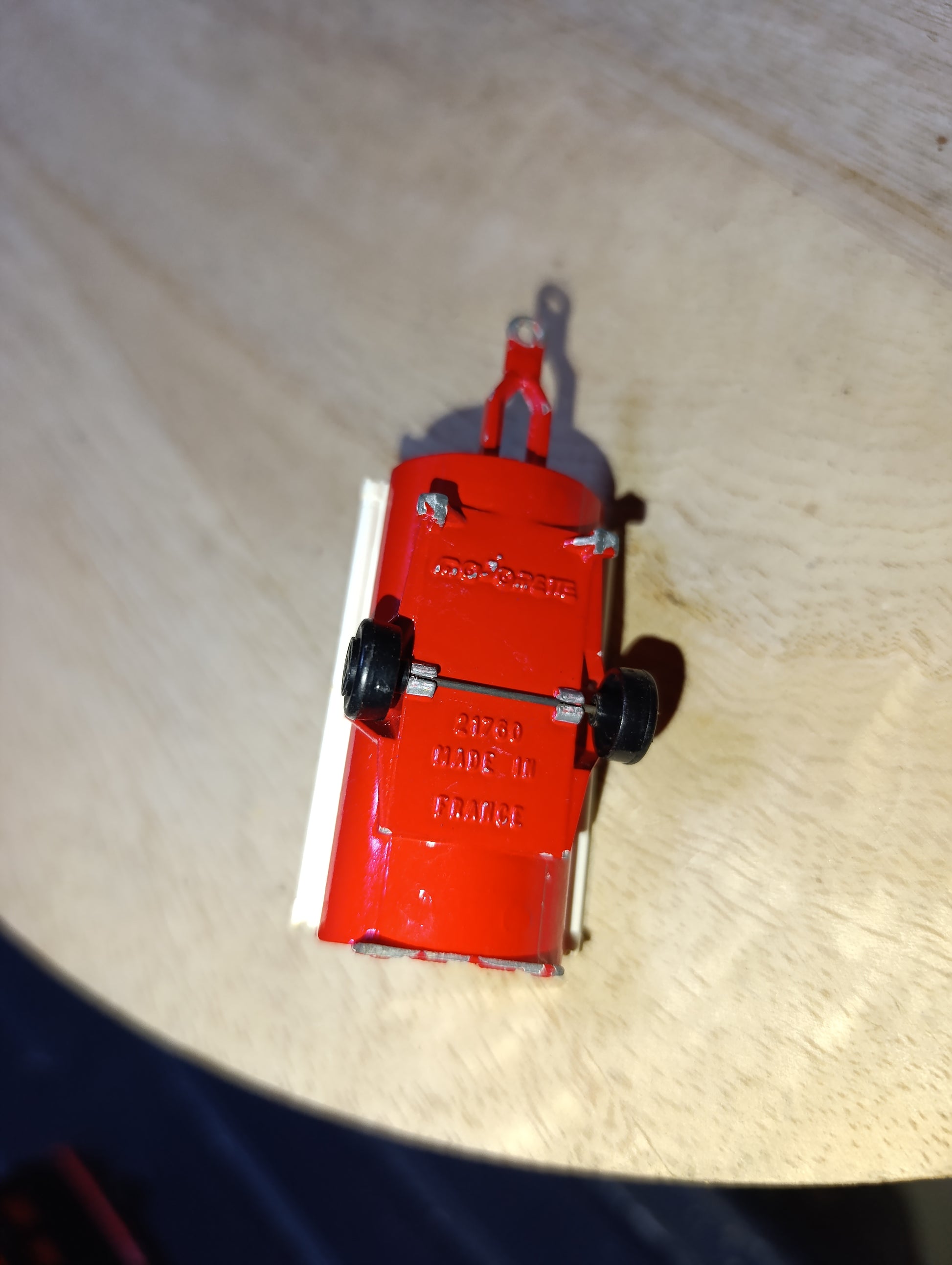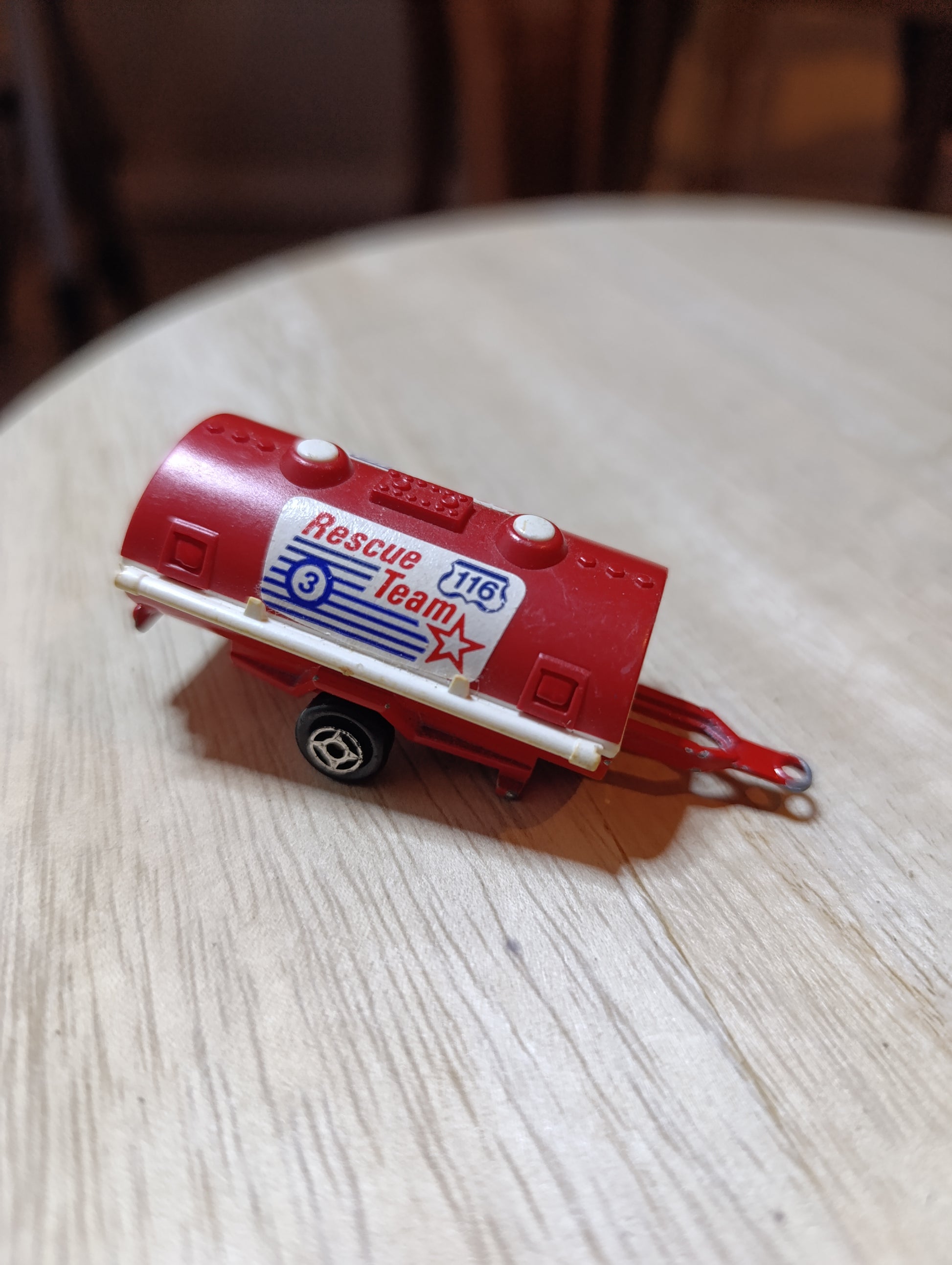 Petite citerne de secours Majorette référence 21760, modèle “Rescue Team 116” couleur rouge/orange, échelle environ 1/60 (5 cm). Corps en métal moulé, petits détails sérigraphiés “France” et marquages “Pompiers”. Parfait pour collection vintage pompiers, diorama ou fan de Majorette.