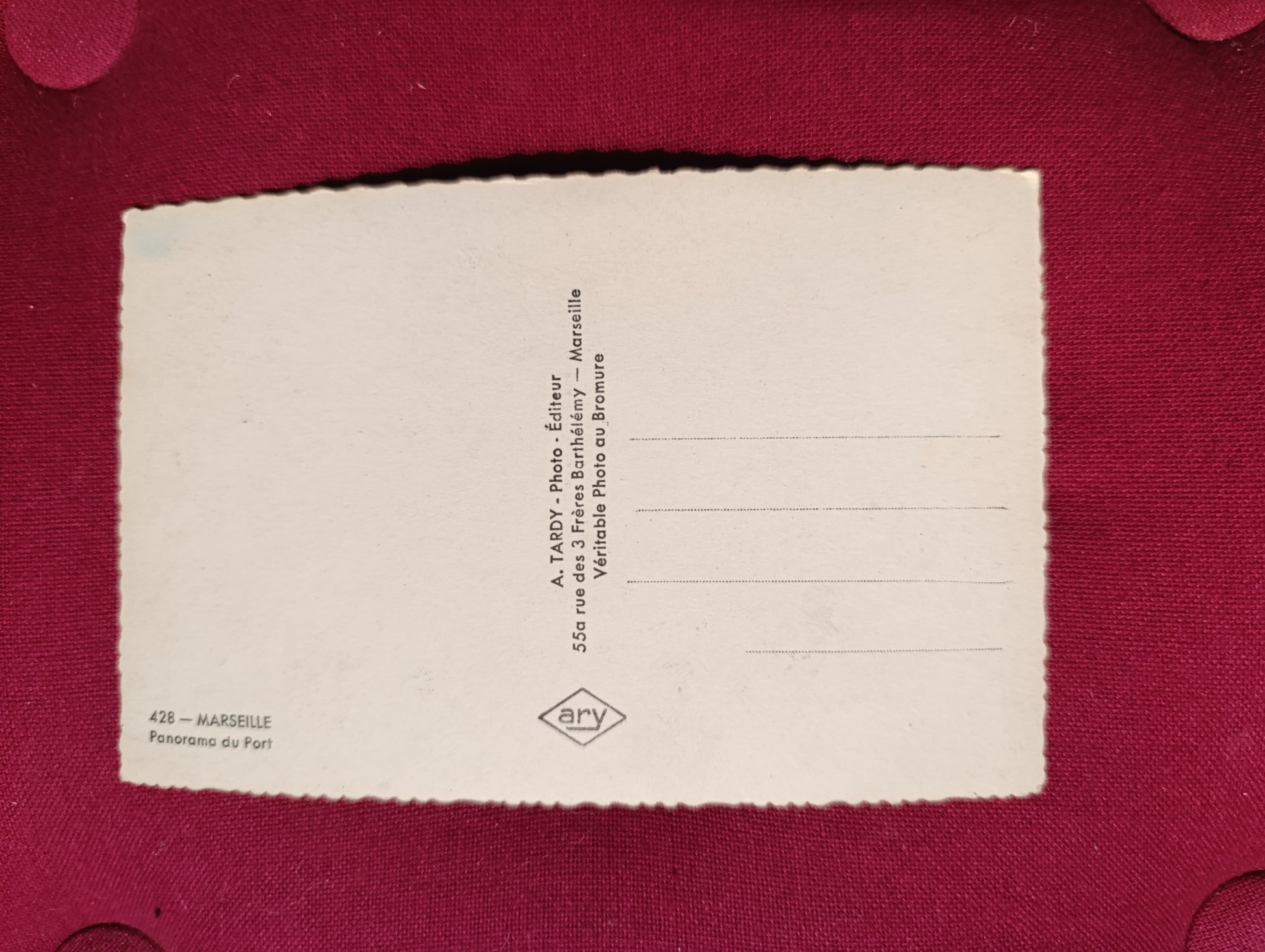 Carte postale ancienne en photo colorisée représentant un large panorama du port de Marseille, avec de nombreuses embarcations amarrées, les quais animés et la ville en arrière-plan. Très belle vue d’ensemble emblématique de la cité phocéenne, mettant en valeur l’activité maritime et urbaine. Carte non écrite / non circulée, dos vierge, éditée par A. Tardy – Marseille. Bords dentelés, légères traces du temps normales pour l’âge, très bel état général. Carte recherchée pour les collectionneurs de Marseille, ports, vues panoramiques et cartes anciennes colorisées.