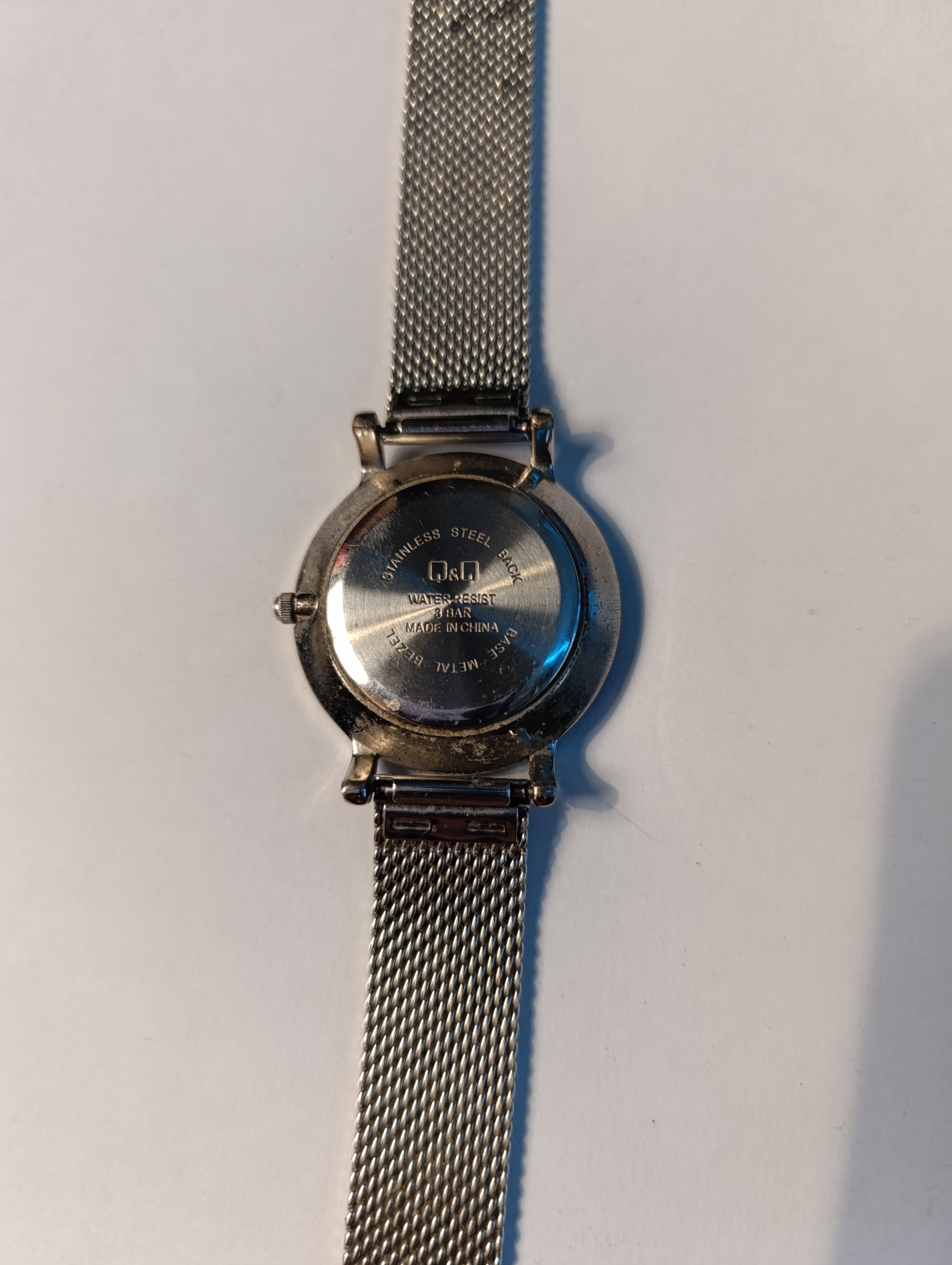 montre femme, q&q, quartz, montre bracelet, bracelet maille acier, montre élégante, montre minimaliste, montre occasion, montre fonctionnelle, cadran noir, montre chic, montre vintage moderne