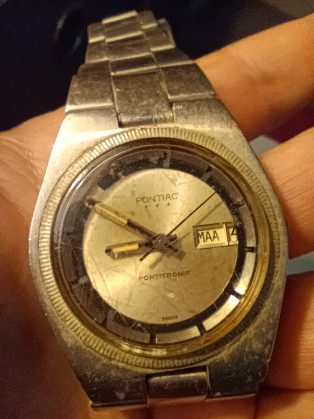 montre pontiac, pontiac pontitronic, montre vintage, montre suisse, montre acier, montre jour, horlogerie ancienne, montre mécanique, montre bracelet, collection montre