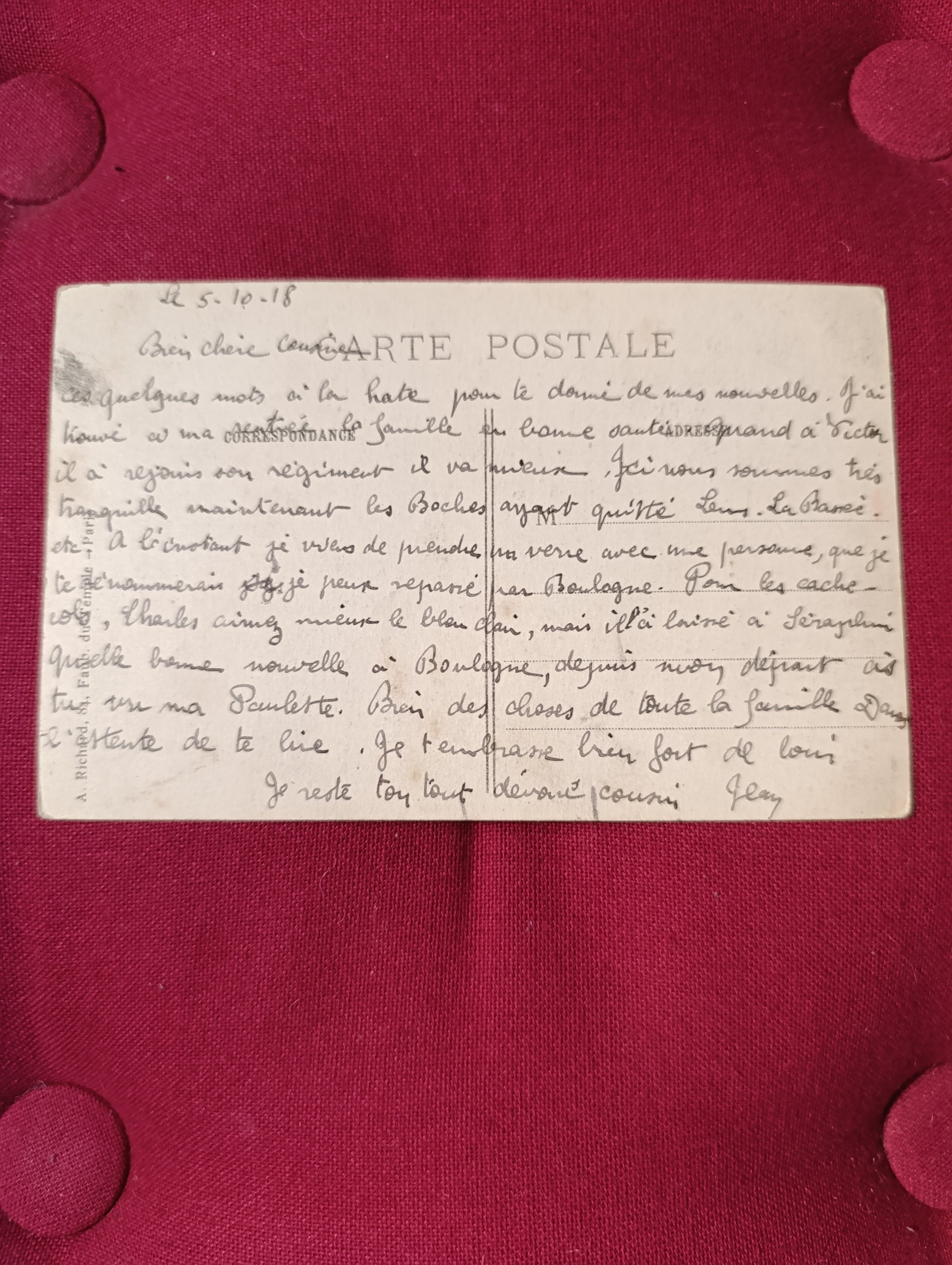 Carte postale ancienne originale montrant les ruines des Halles de Nieuport après les bombardements de la Première Guerre mondiale. Vue saisissante des destructions avec architecture médiévale fortement endommagée et personnages au premier plan. Carte écrite et envoyée, datée du 5 octobre 1918, avec long message manuscrit bien conservé. Témoignage historique fort de la Grande Guerre en Belgique, très recherché par les collectionneurs WW1. État correct à bon, patine et traces du temps cohérentes avec l’époque.