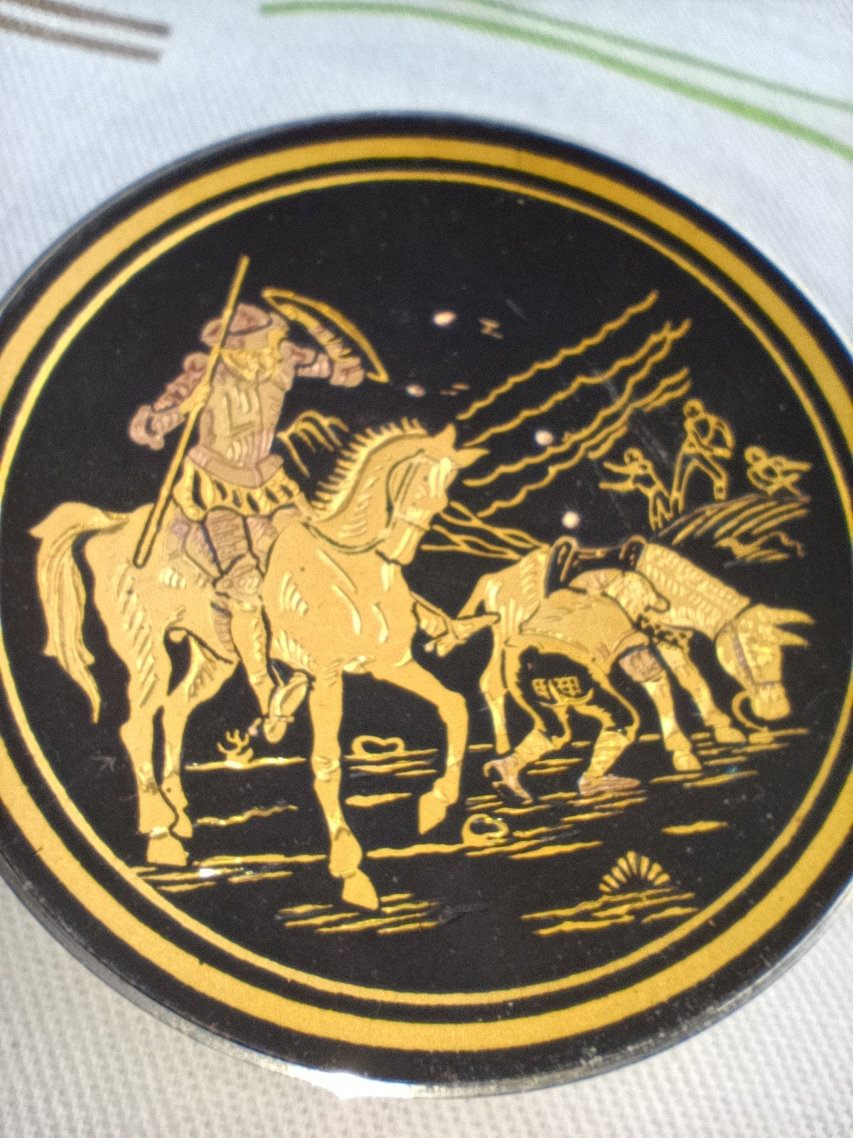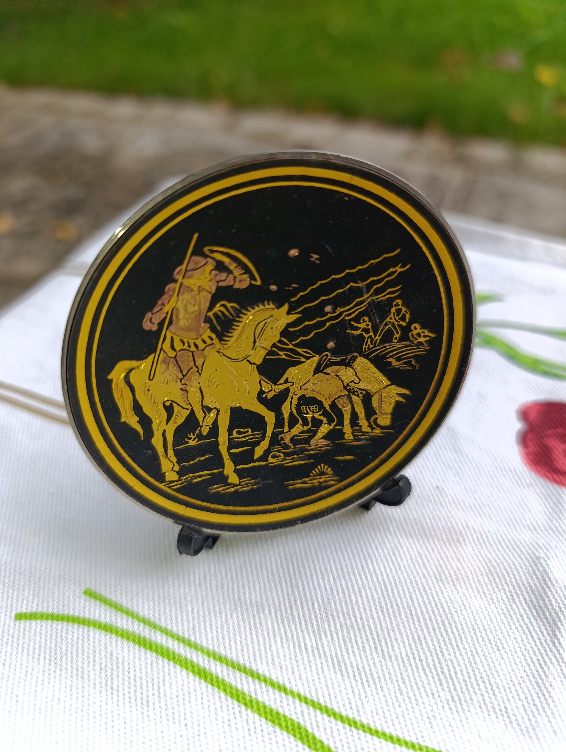 Charmante assiette décorative en métal (diamètre 8 cm), ornée de scènes dorées typiquement espagnoles sur fond noir : un torero affrontant un taureau et un cavalier. Réalisée selon la technique du damasquinage de Tolède, avec incrustations dorées délicates. Un bel objet de décoration vintage, emblématique de l’artisanat espagnol.