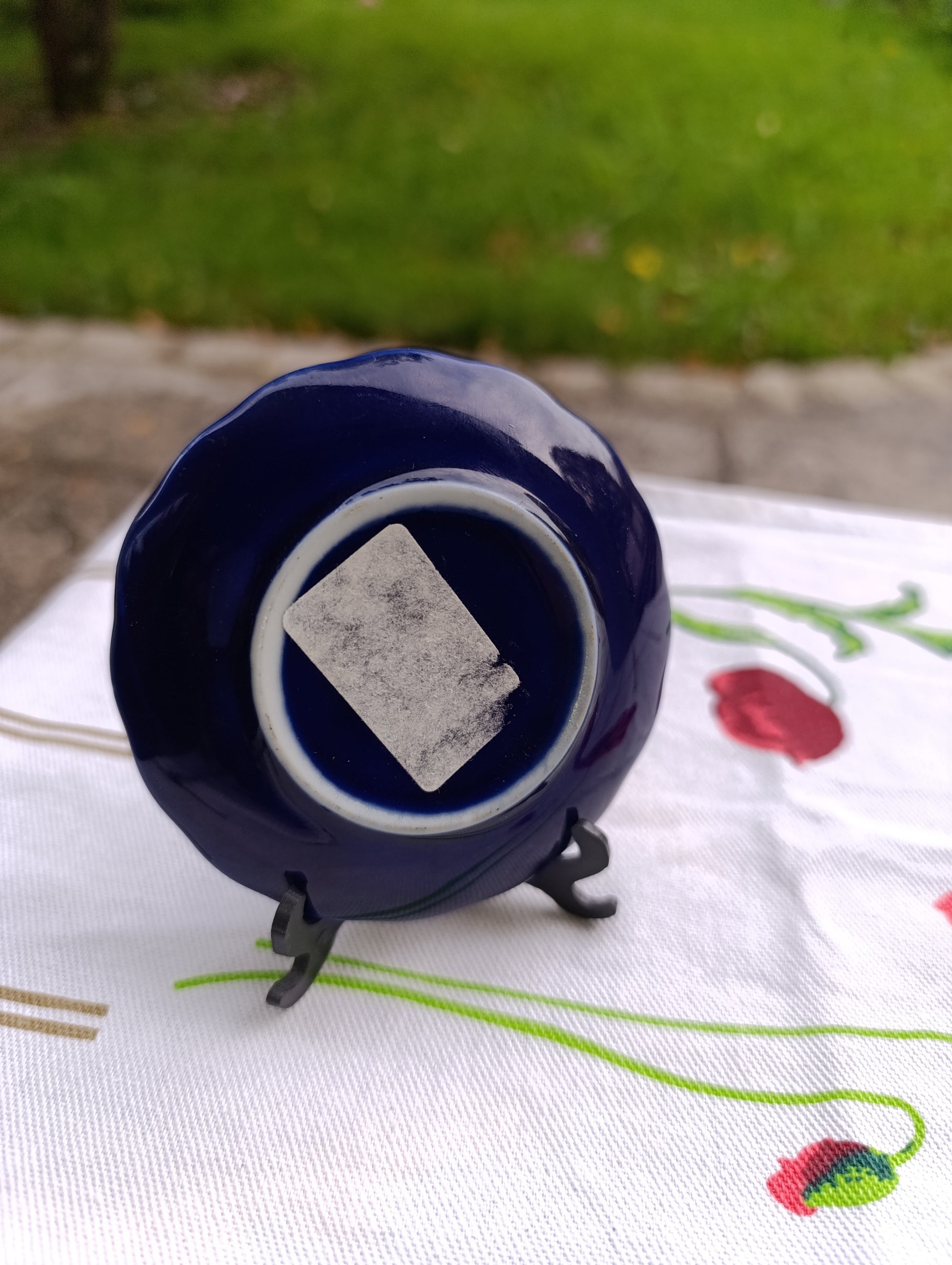 Charmante assiette souvenir de Floride en porcelaine bleue cobalt, ornée d’un décor doré de coquillages, algues et étoile de mer, avec l’inscription « Florida ». Finition bord doré. Diamètre 9 cm. Élégant petit souvenir vintage des États-Unis, parfait pour les collectionneurs ou pour une déco bord de mer.