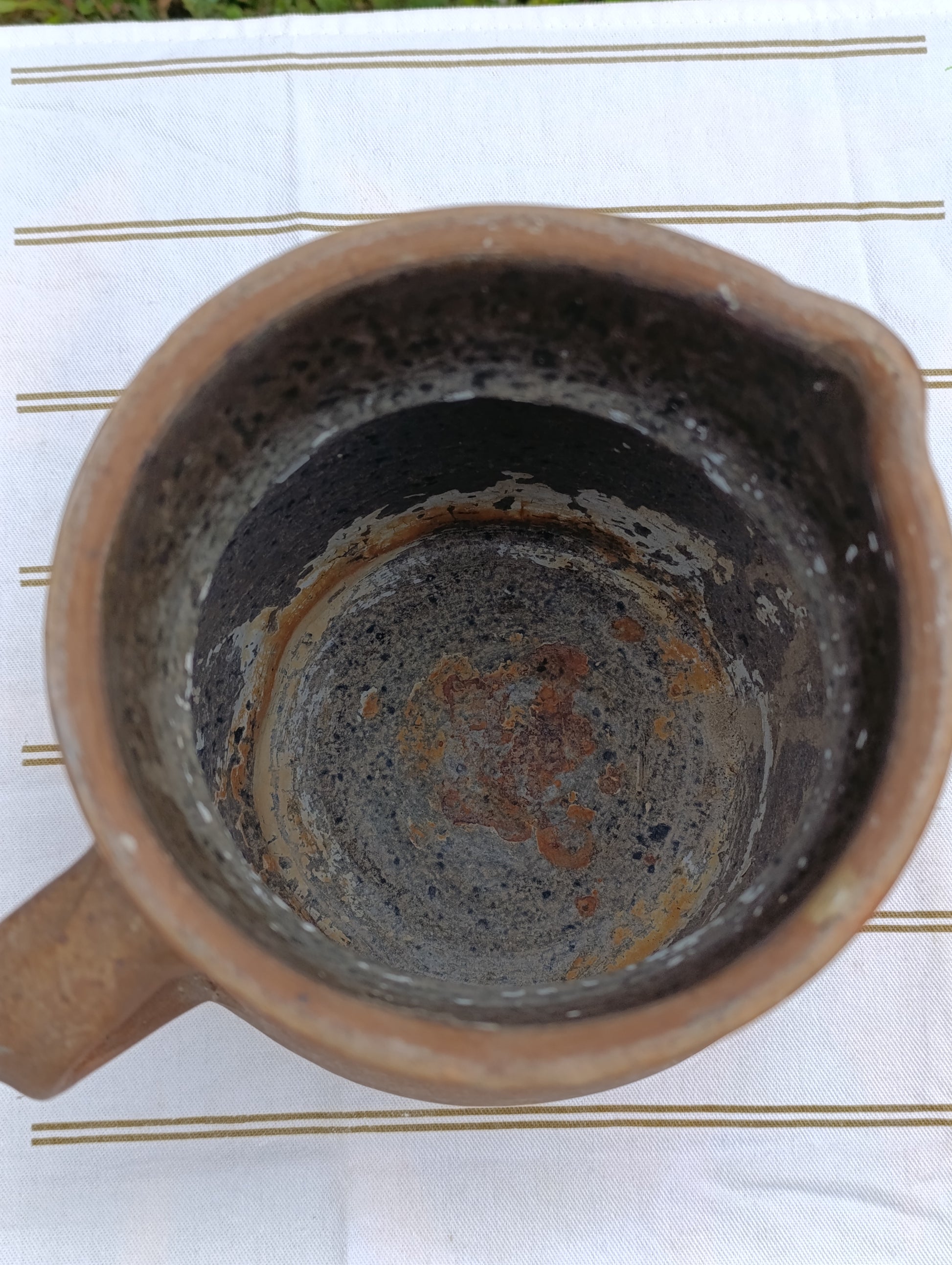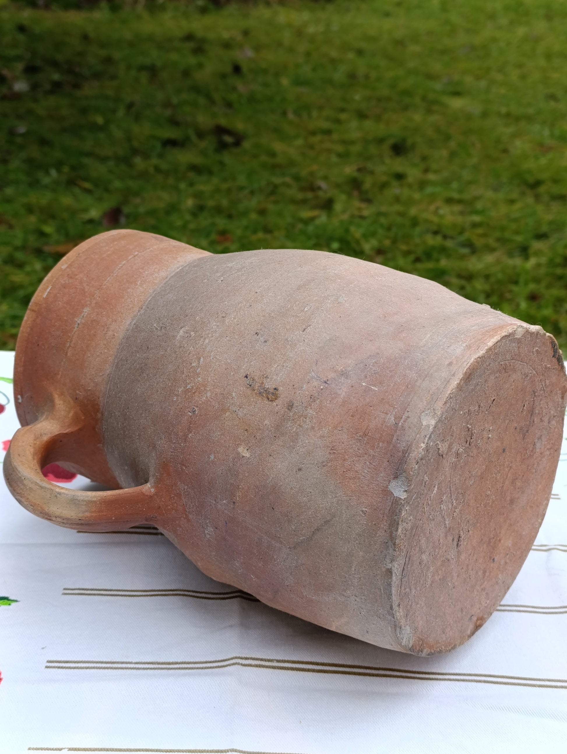 Ancien pichet en terre cuite de belle épaisseur, à l’aspect brut et authentique. Pièce lourde et stable, façonnée dans une terre naturelle non émaillée, avec une anse robuste et une forme traditionnelle.