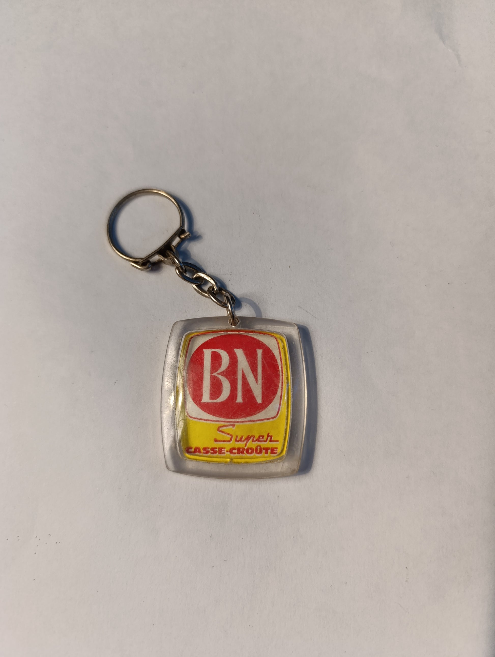 Porte-clés ancien en plastique translucide double face. Une face publicitaire BN Super Casse-Croûte, l’autre avec illustration de l’astronaute Frank Borman (mission Apollo). Format carré env. 3,5 × 3,5 cm. Anneau et chaîne métal d’origine. Traces d’usage légères compatibles avec l’âge, couleurs encore bien visibles. Bel objet de collection publicité vintage, espace et conquête spatiale.