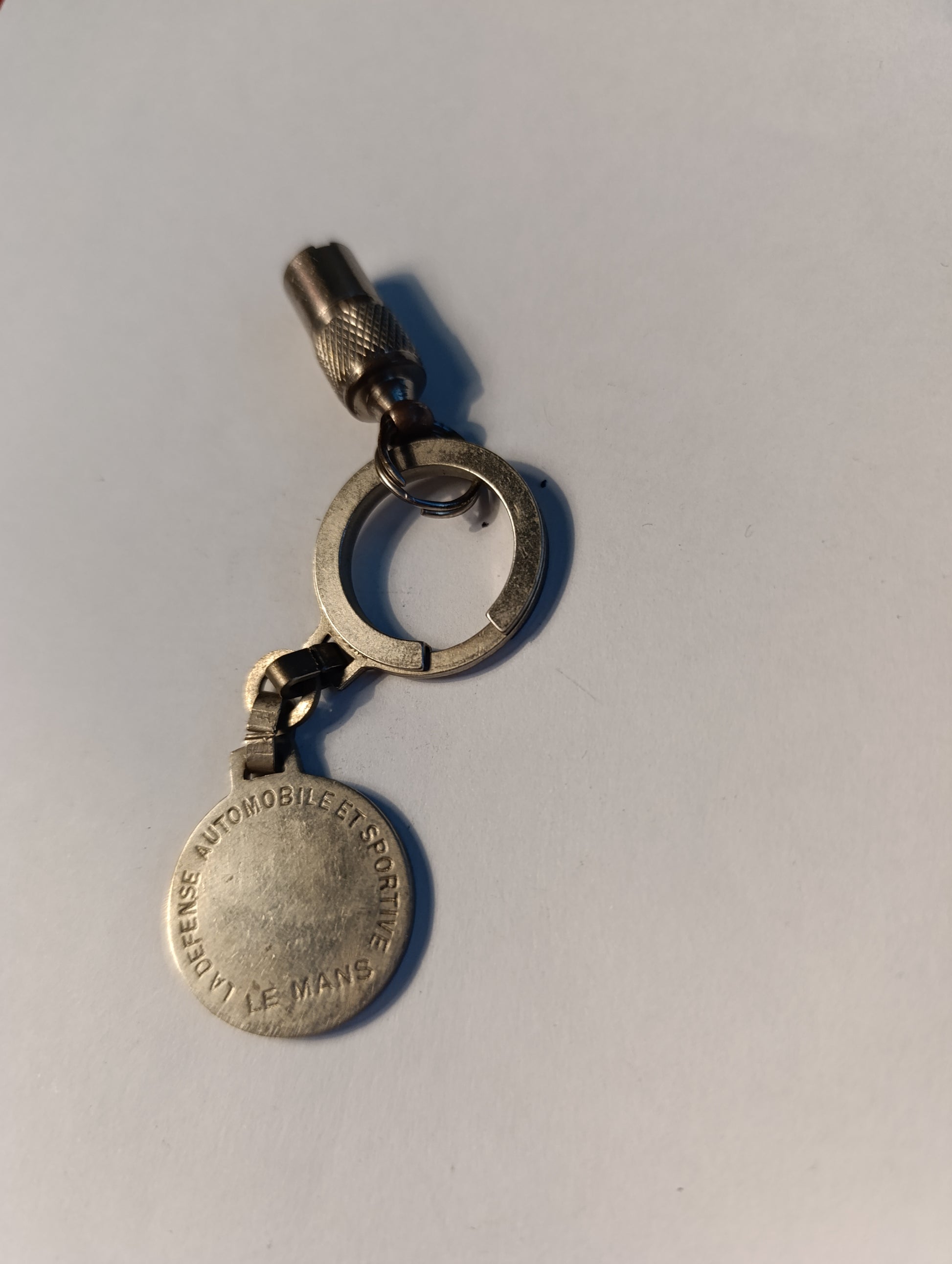 Porte-clés ancien publicitaire DAS, médaillon rond émaillé bleu avec lettrage blanc. Diamètre env. 2,5 cm. Anneau métallique avec système à vis et chaîne d’origine. Belle patine, émail bien conservé, traces d’usage normales liées à l’âge. Objet publicitaire sobre et élégant, recherché pour collection de porte-clés anciens, marques industrielles ou publicité française vintage.