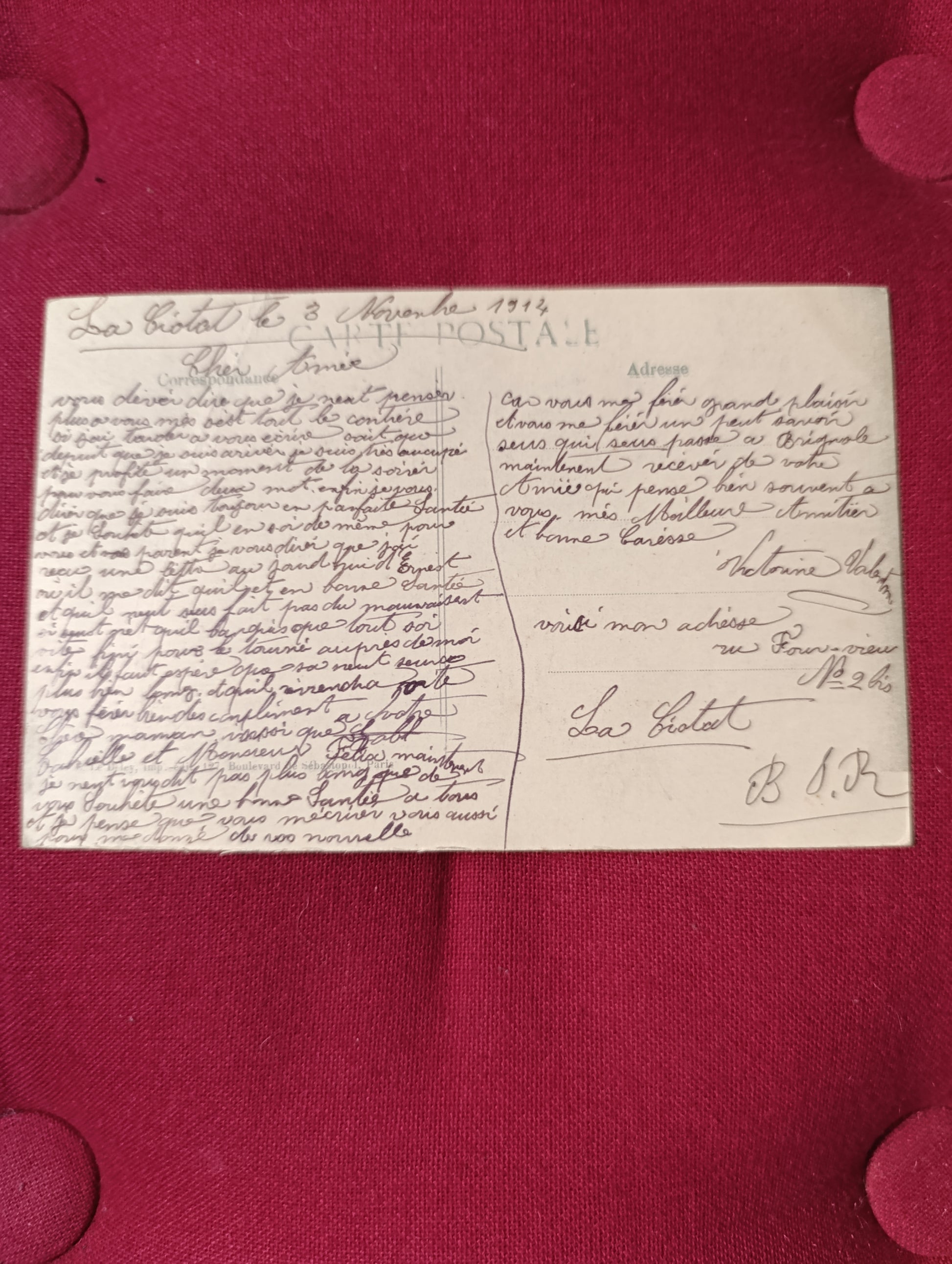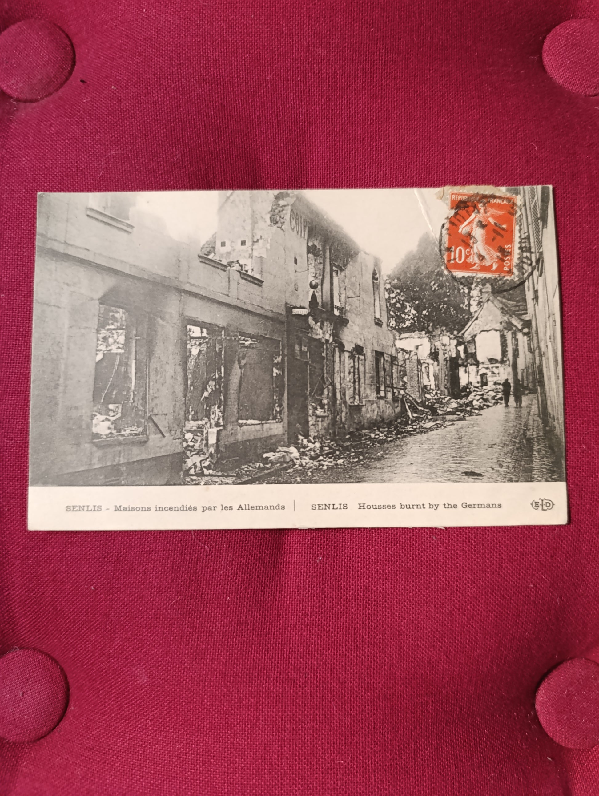 Carte postale ancienne originale montrant une rue de Senlis après les destructions de 1914, avec maisons éventrées et décombres consécutifs aux incendies provoqués par les troupes allemandes. Carte bilingue français/anglais (Maisons incendiées par les Allemands / Houses burnt by the Germans), affranchie avec timbre de 10 c rouge et oblitération postale. Correspondance manuscrite datée 3 novembre 1914, témoignage direct des événements du début de la Première Guerre mondiale. Document à forte valeur historique et mémorielle, très recherché pour l’histoire de Senlis et des exactions de 1914. État correct à bon, usure normale, légères traces du temps, écriture bien lisible au verso.