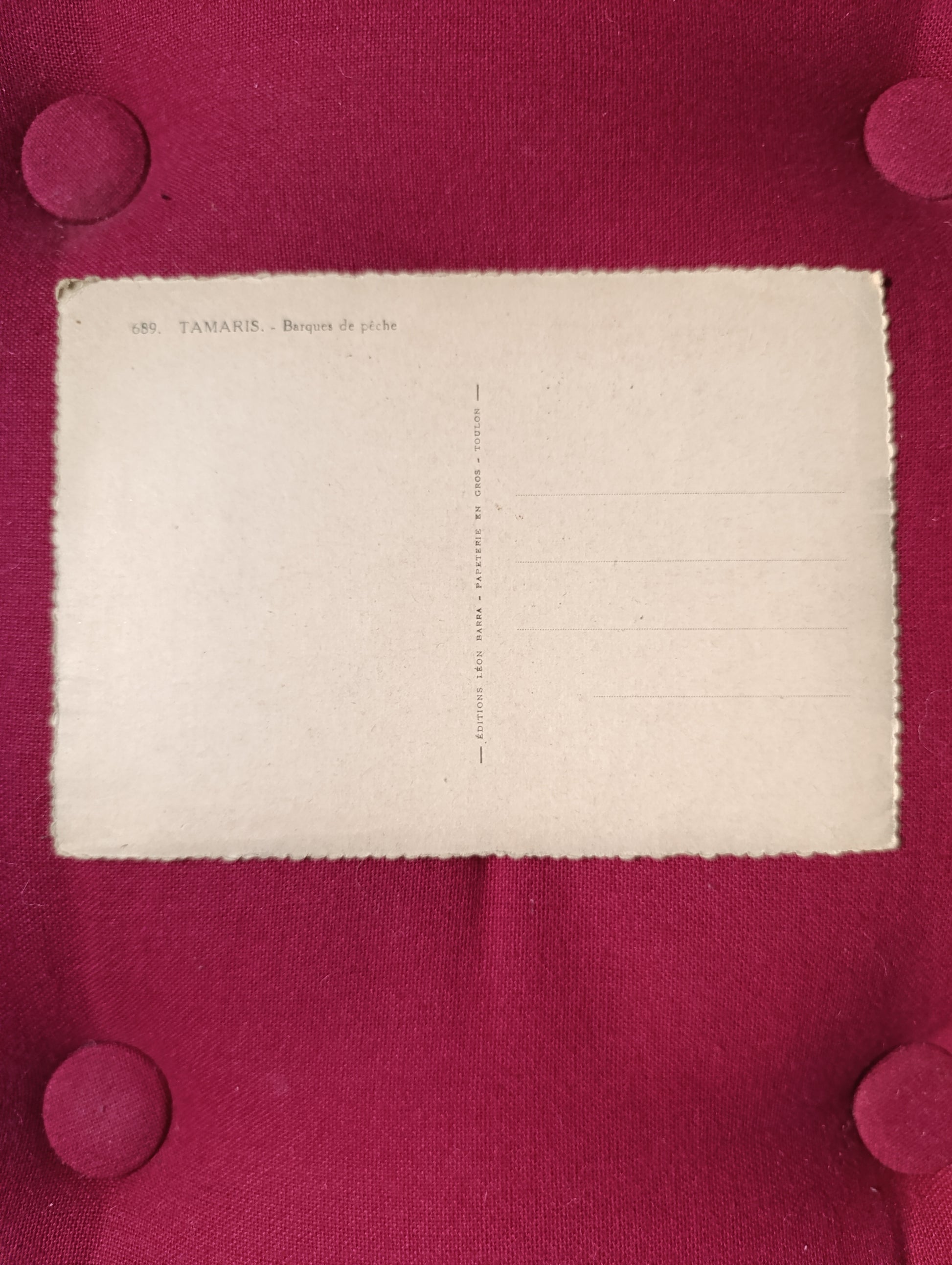 Carte postale ancienne originale représentant les barques de pêche à Tamaris, joli port du Var. Belle vue maritime avec barques amarrées le long du rivage, digue en pierres, collines et reliefs en arrière-plan. Ambiance calme et authentique du littoral méditerranéen au début du XXe siècle. Carte non écrite, dos vierge, bords dentelés, bon état général avec légères traces du temps. Intéressante pour les collectionneurs de cartes maritimes, ports, bateaux de pêche et Provence ancienne.