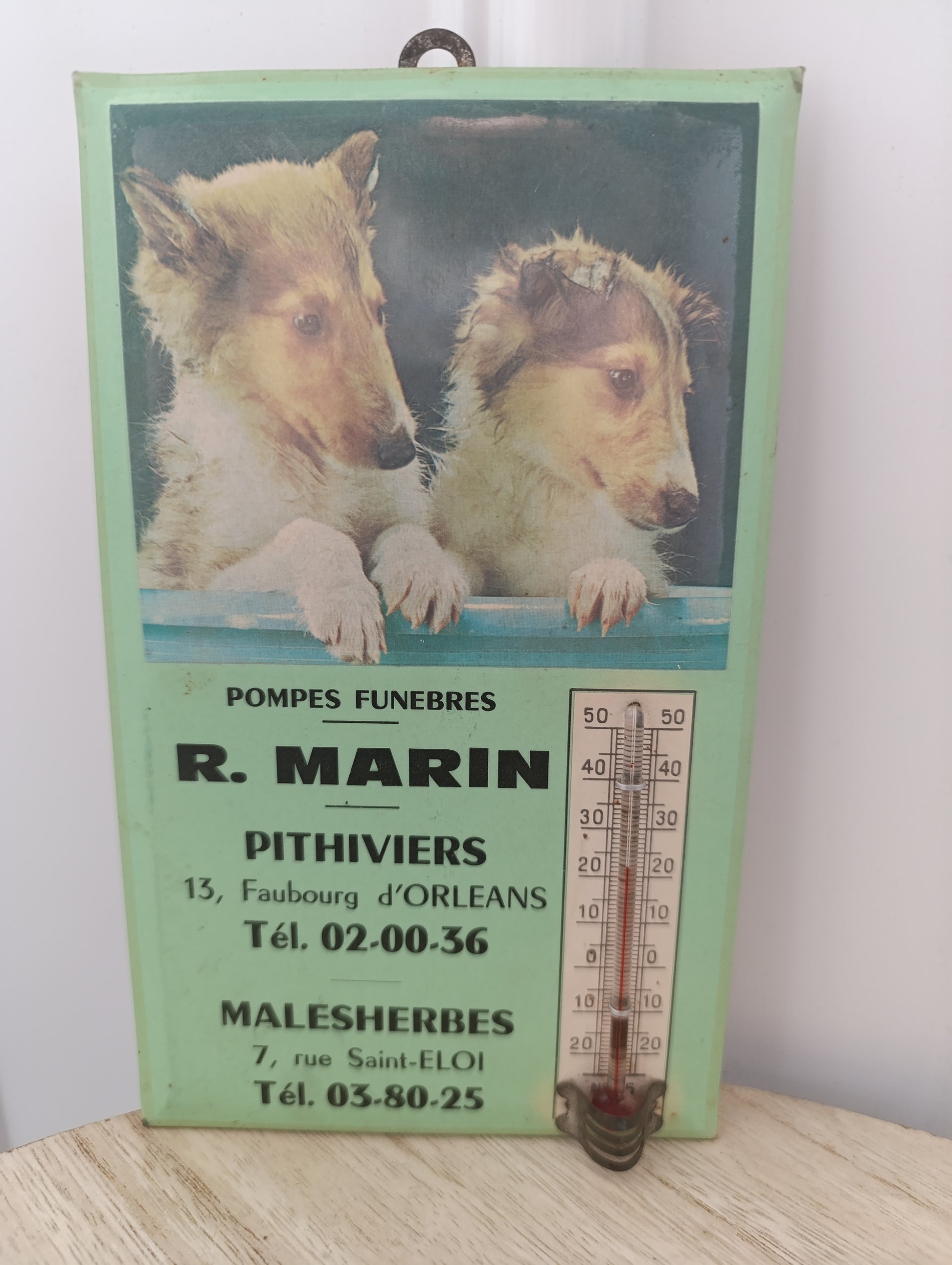 Thermomètre mural ancien au charme rétro typique des années 60-70. Publicité pour les Pompes Funèbres R. Marin à Pithiviers et Malesherbes, illustré d’une photo de deux chiots. Fabriqué à Tours, impression directe sur métal avec dos en carton et crochet de suspension.
