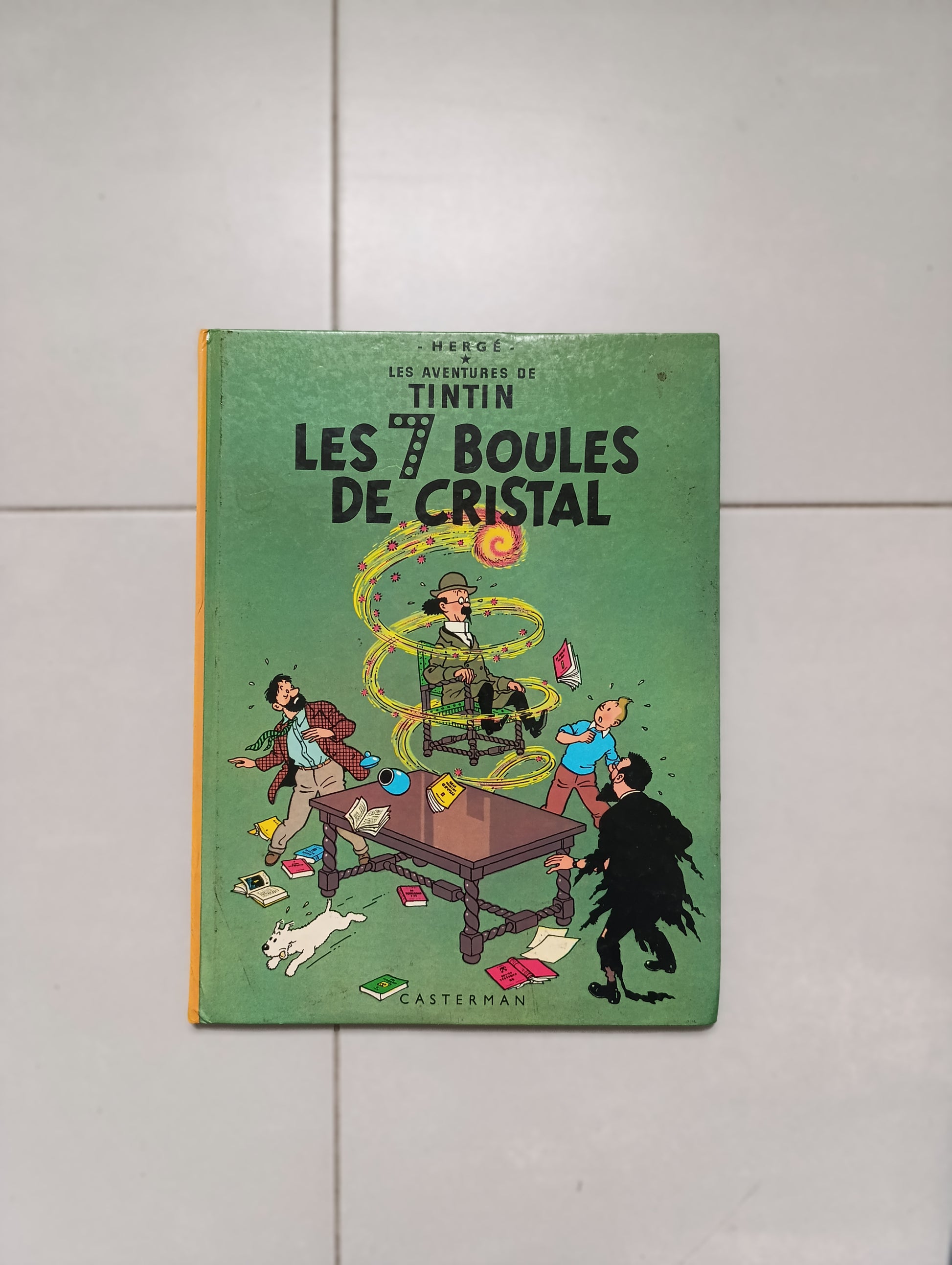 tintin, hergé, les 7 boules de cristal, casterman, 1975, dos toilé jaune, bd, bande dessinée, aventures de tintin, album cartonné, couleur, franco-belge, classique bd