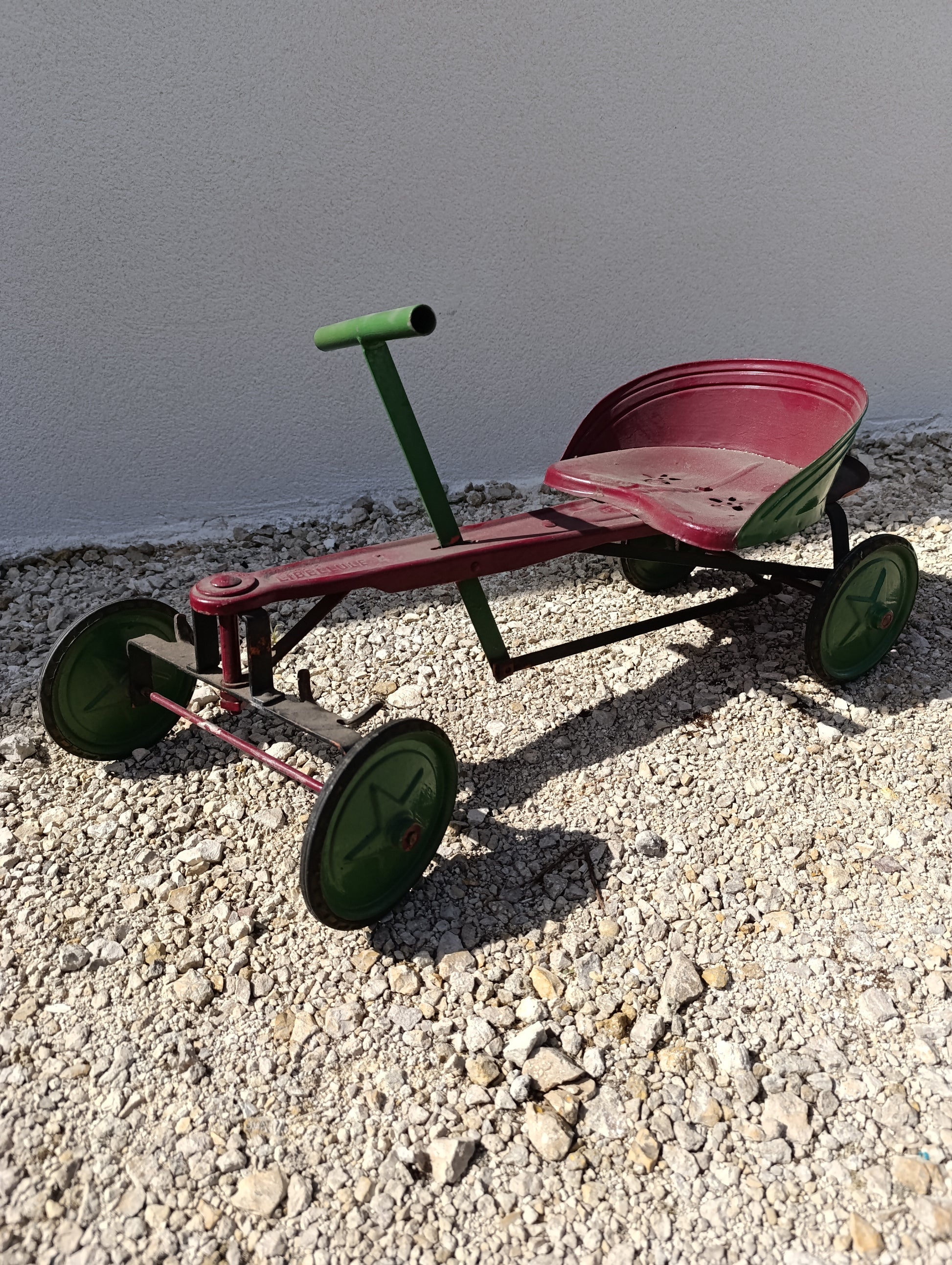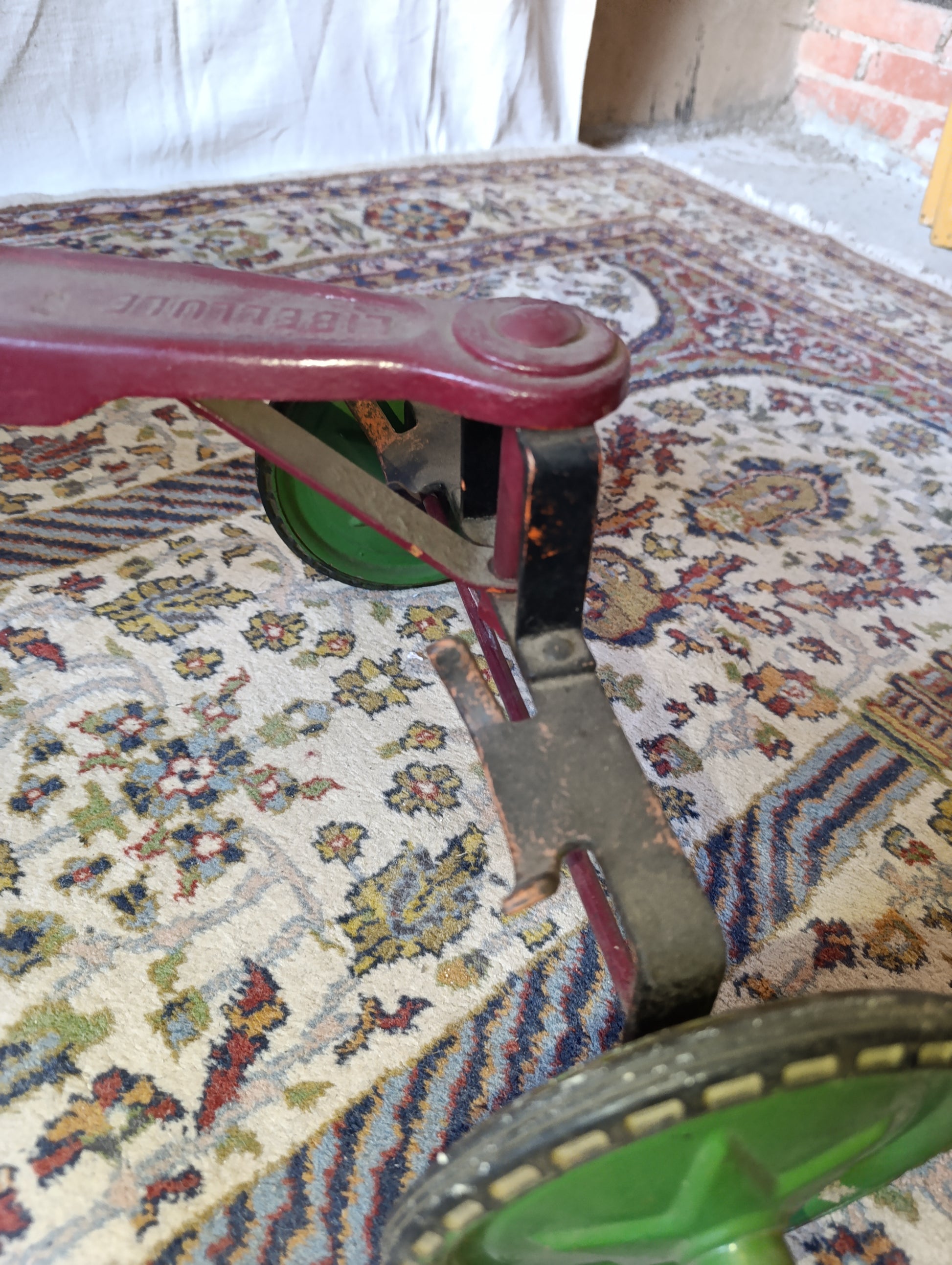 tricycle ancien, tricycle libellule, jouet vintage métal, jouet ancien enfant, jouet collection, tricycle enfant rétro, vélo jouet ancien, jouet ancien décoration, jouet métal années 50, brocante jouets anciens