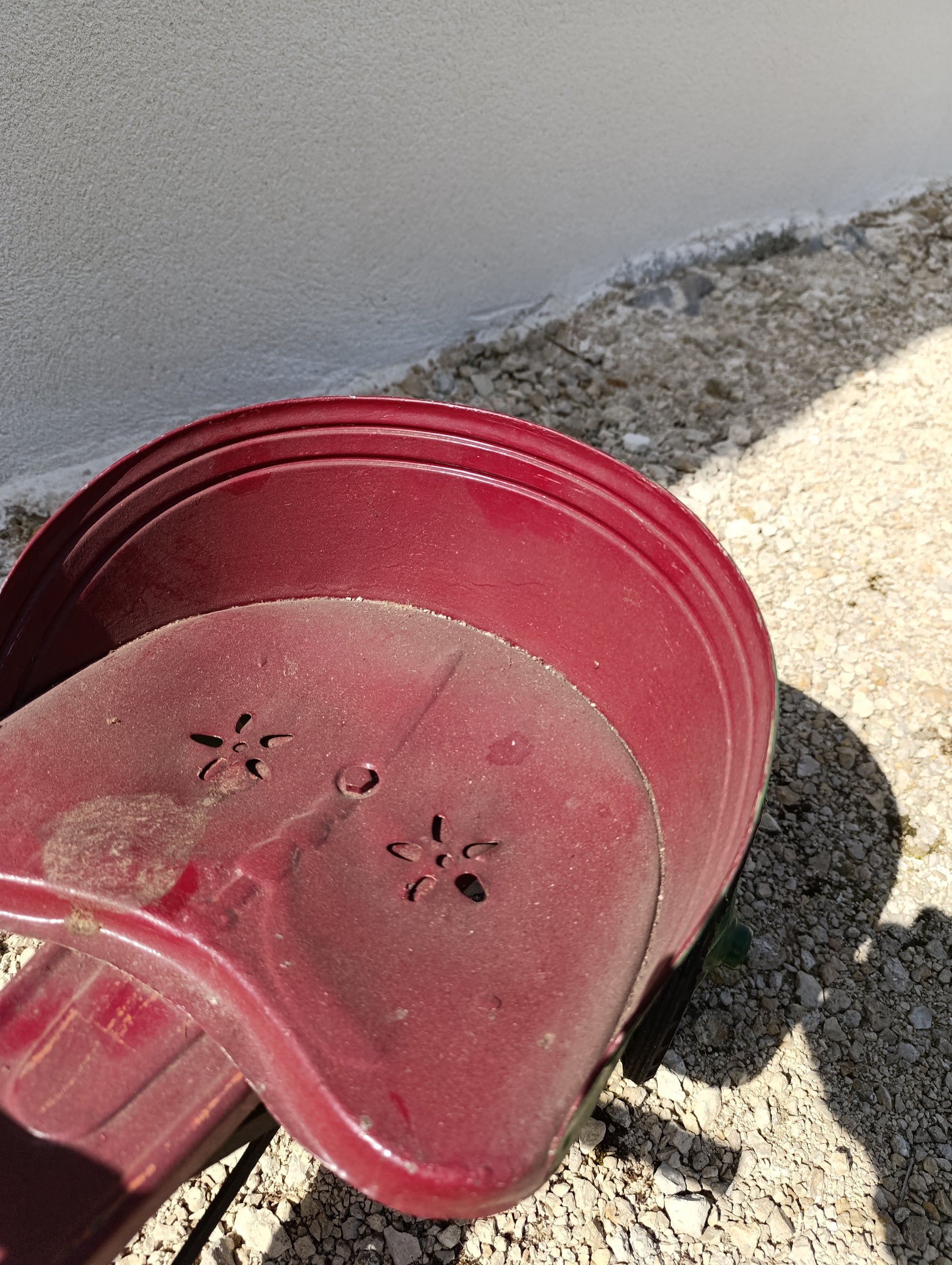 Couleurs d’origine : assise bordeaux, structure verte, roues métalliques.