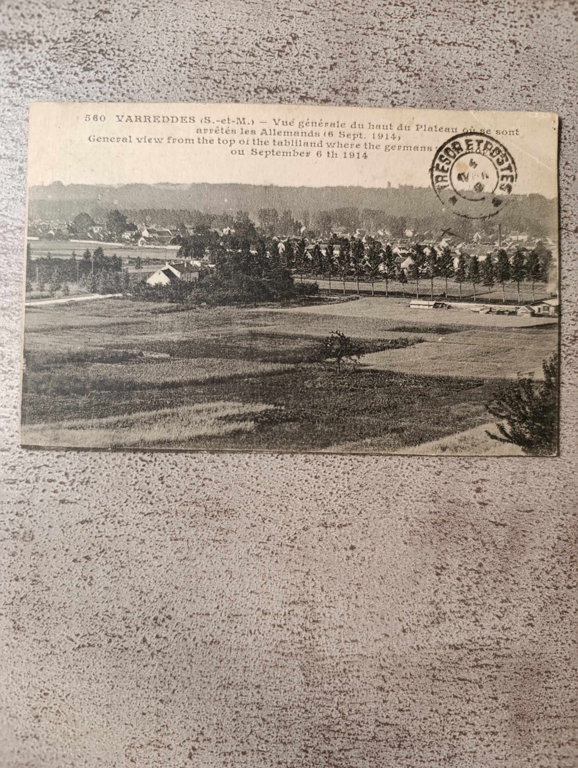 Carte postale ancienne de la Première Guerre mondiale représentant une vue panoramique prise depuis le plateau de Varreddes, lieu stratégique où l’avancée allemande fut stoppée le 6 septembre 1914 lors de la bataille de la Marne. Paysage rural avec village et champs au premier plan, document historique fort lié aux combats de 1914. Carte ayant circulé, cachet postal visible, correspondance manuscrite au dos. Papier ancien avec patine du temps, petites traces d’usage et pli discret, bon état général pour une carte de guerre.